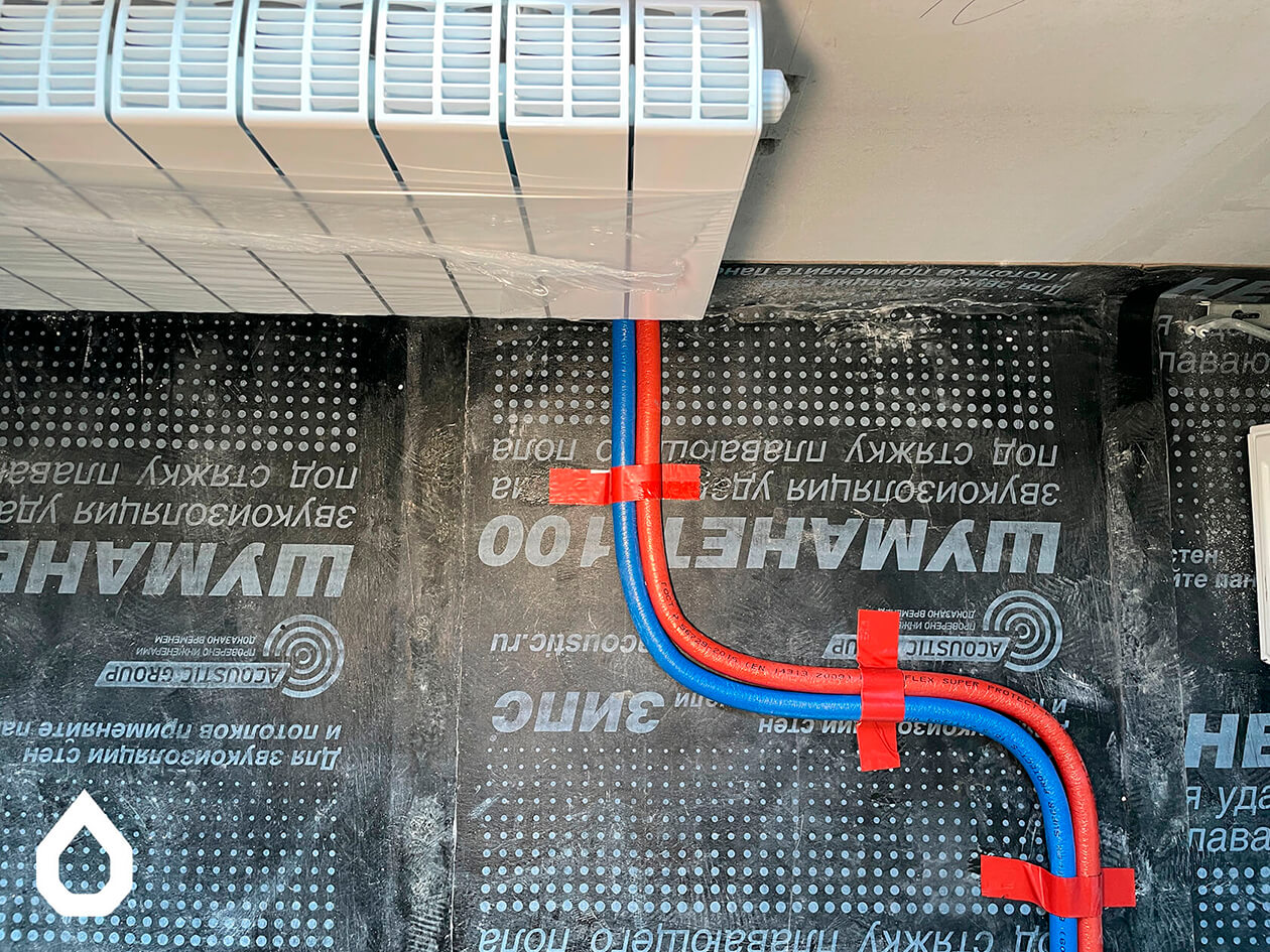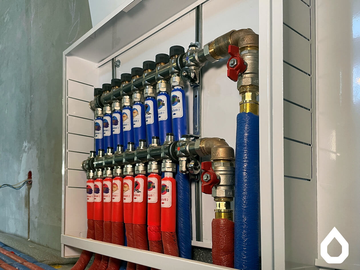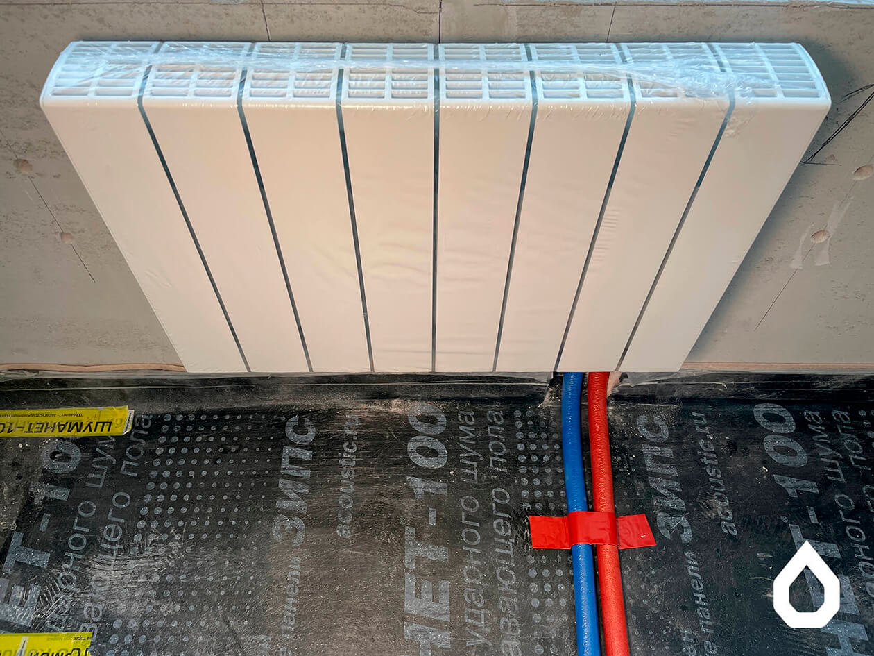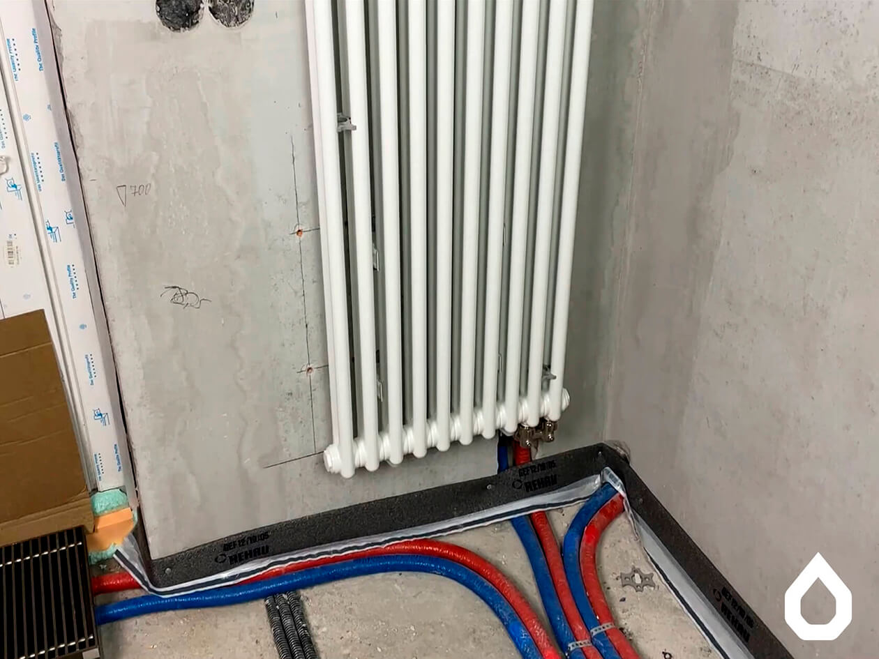 Схема отопления коллекторно-лучевая. Приборы отопления: стальной радиатор Zehnder Charleston, внутрипольные конвекторы Itermic и конвекторы Jaga Mini Canal установленные застройщиком. Обвязка радиатора угловым мультифлексом. Обвязка конвекторов — вентильные краны. Регулировка температуры помещений за счет «Умного дома».