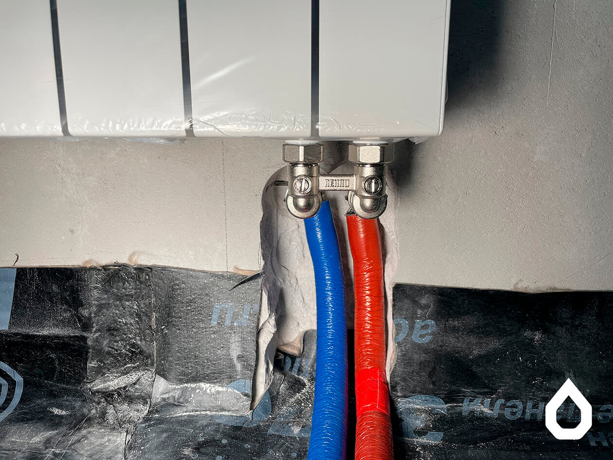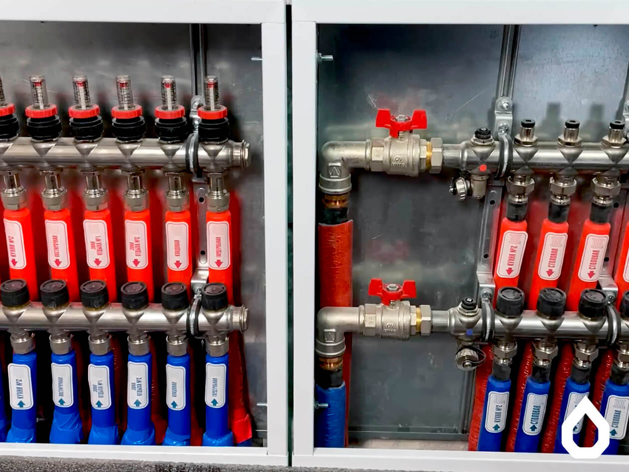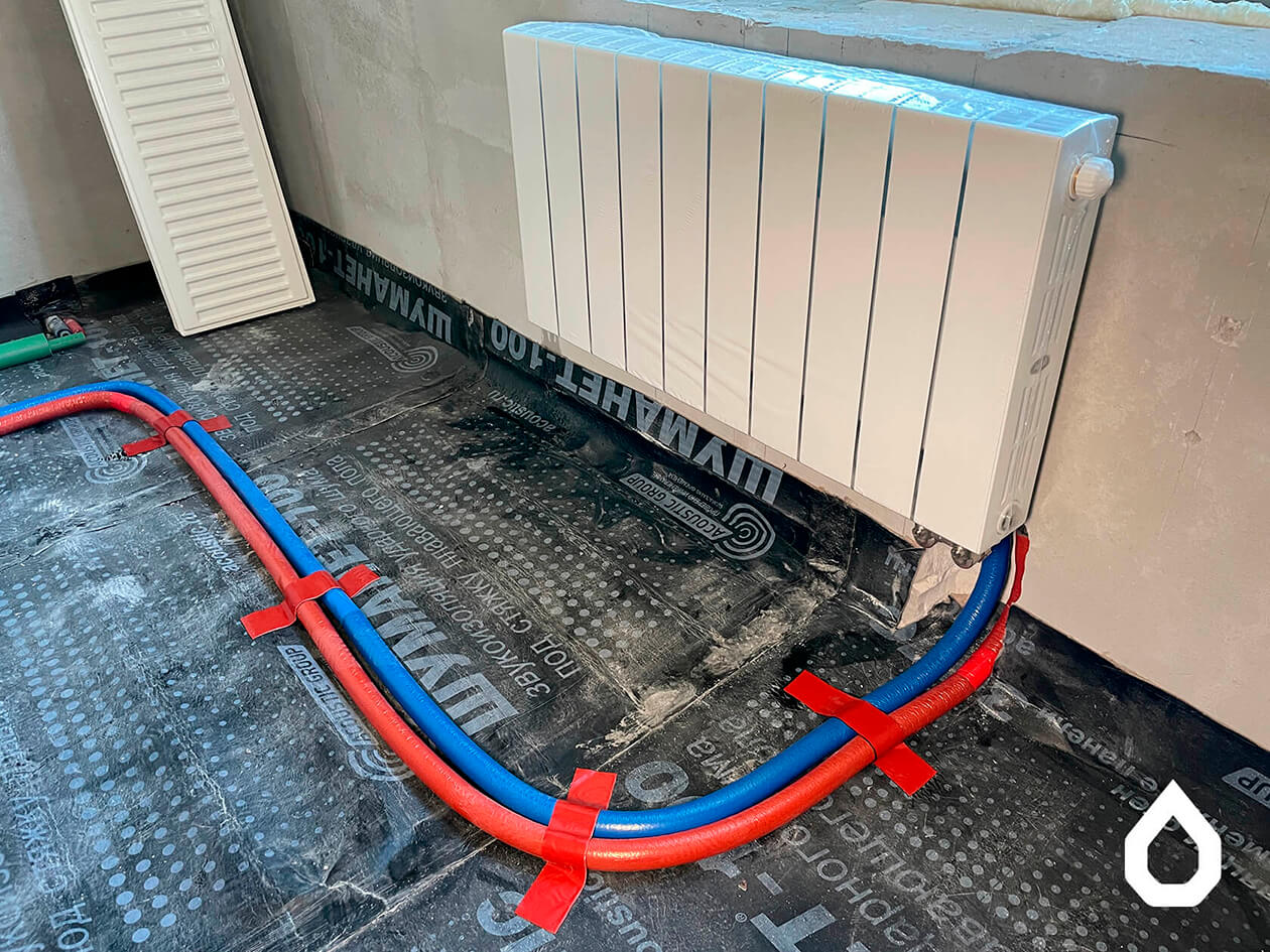Схема отопления коллекторно-лучевая. Приборы отопления: стальной радиатор Zehnder Charleston, внутрипольные конвекторы Itermic и конвекторы Jaga Mini Canal установленные застройщиком. Обвязка радиатора угловым мультифлексом. Обвязка конвекторов — вентильные краны. Регулировка температуры помещений за счет «Умного дома».