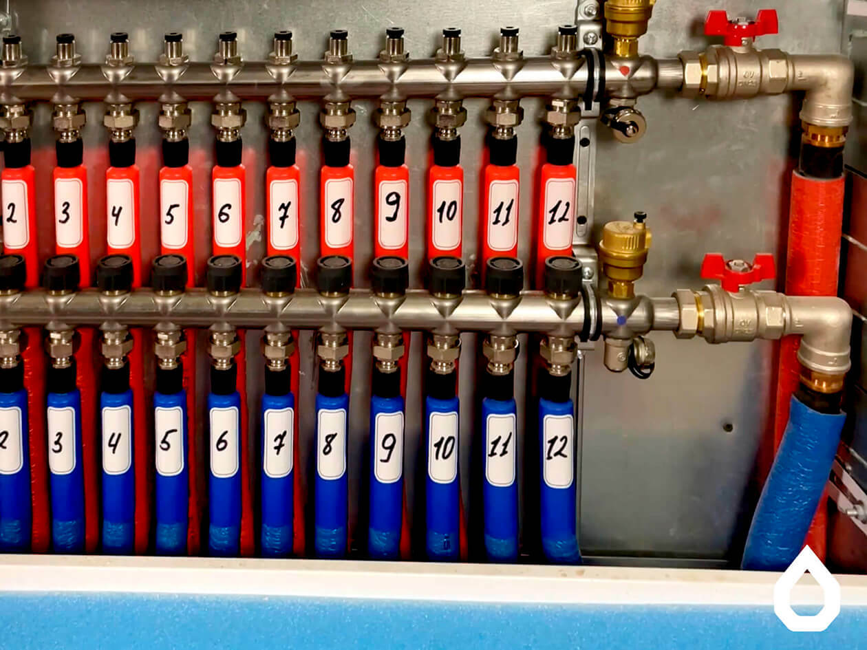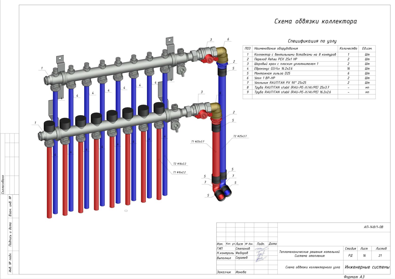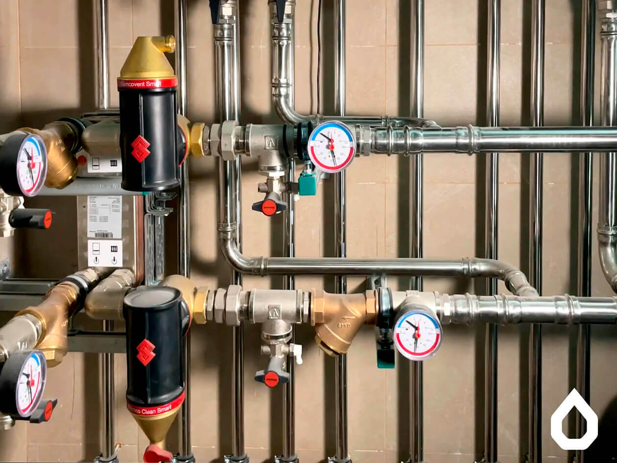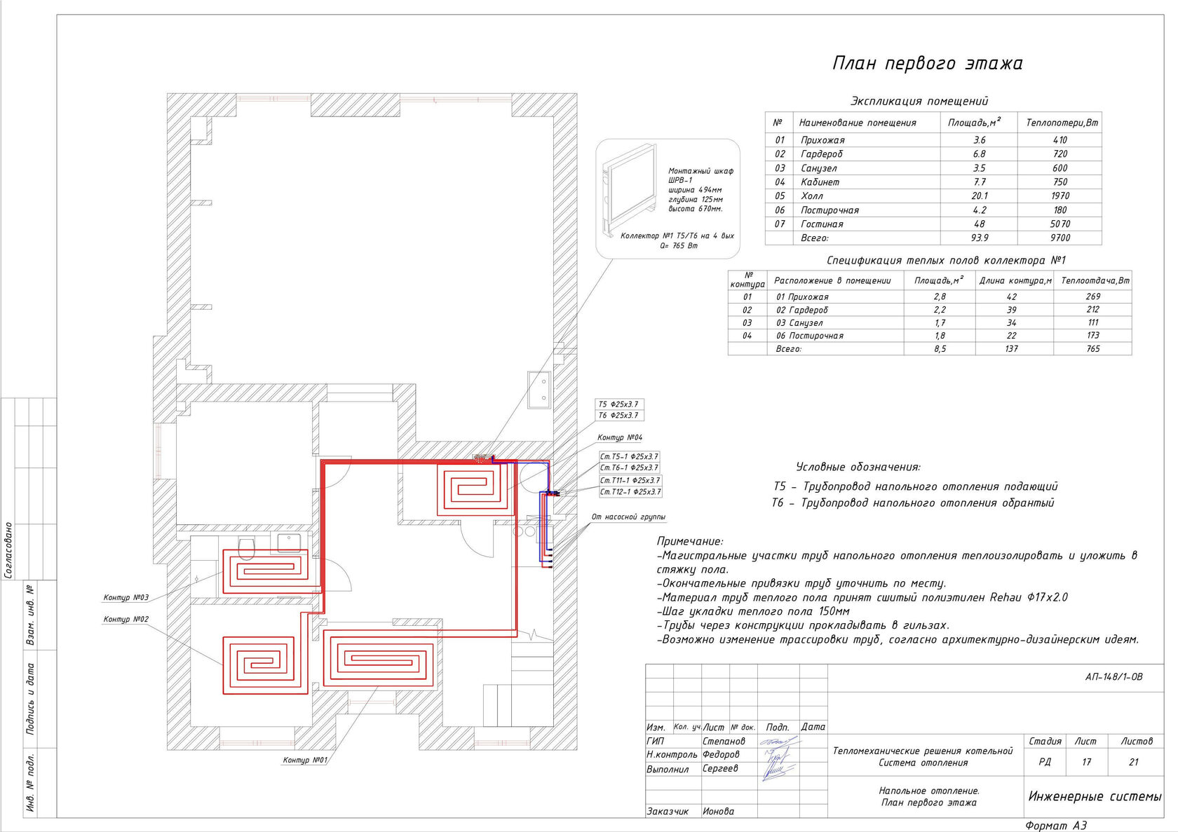 Схема отопления коллекторно-лучевая. Приборы отопления: стальной радиатор Zehnder Charleston, внутрипольные конвекторы Itermic и конвекторы Jaga Mini Canal установленные застройщиком. Обвязка радиатора угловым мультифлексом. Обвязка конвекторов — вентильные краны. Регулировка температуры помещений за счет «Умного дома».