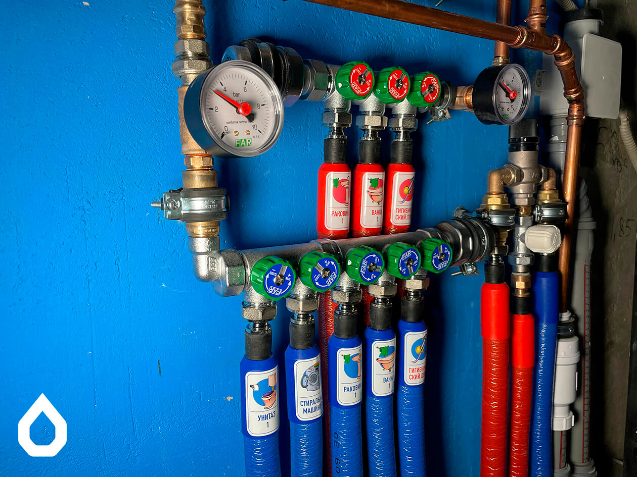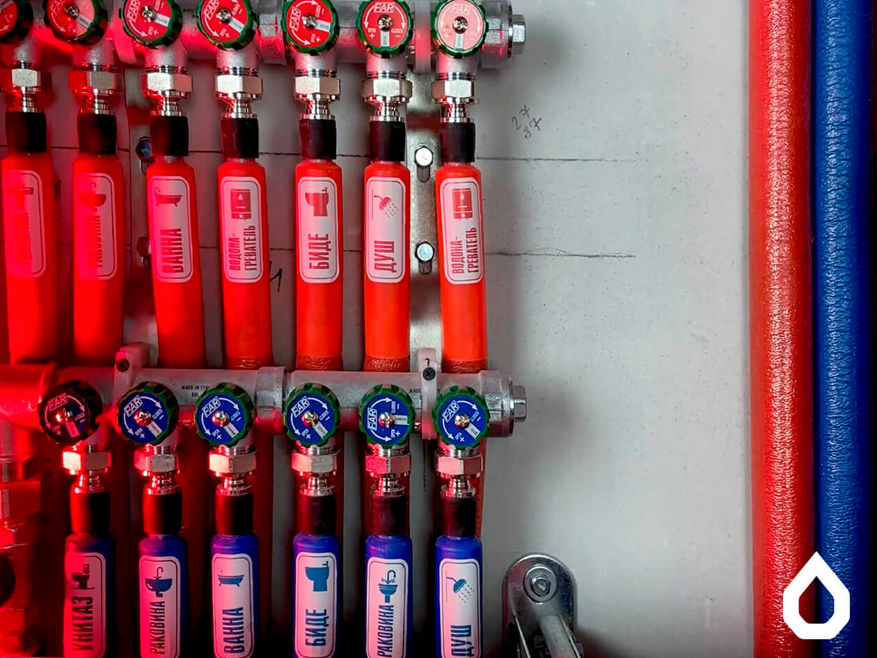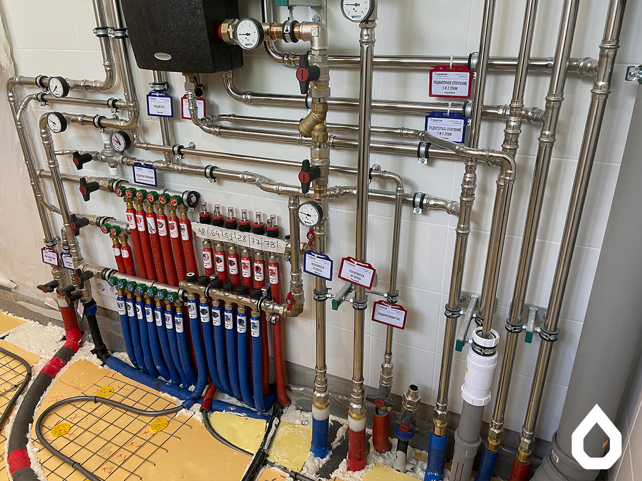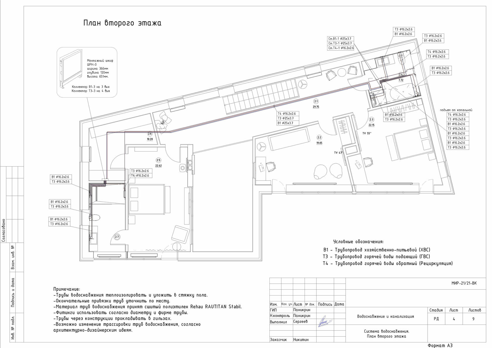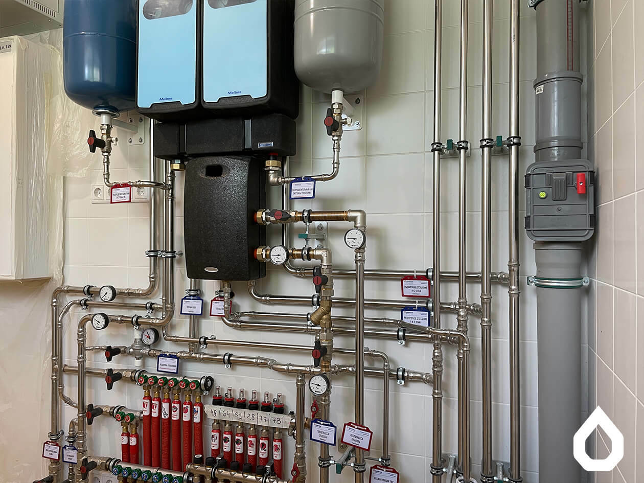 Проект водоснабжения включает в себя распределительные коллекторы и трубопроводы водоразбора. Узлы ввода и распределения стоят в инженерных каналах. На вводе следующие элементы: шаровый кран, комплект защиты от протечки, фильтр грубой очистки, редуктор давления, счетчик водяной, обратный клапан и фильтр тонкой очистки. Материал труб — сшитый полиэтилен фирмы ТЕСЕ. Коллекторы ¾ × ¾ с выходами под евроконус. Канализация — PPs трубы Ostendorf и RAU-PP Rehau на стояках.