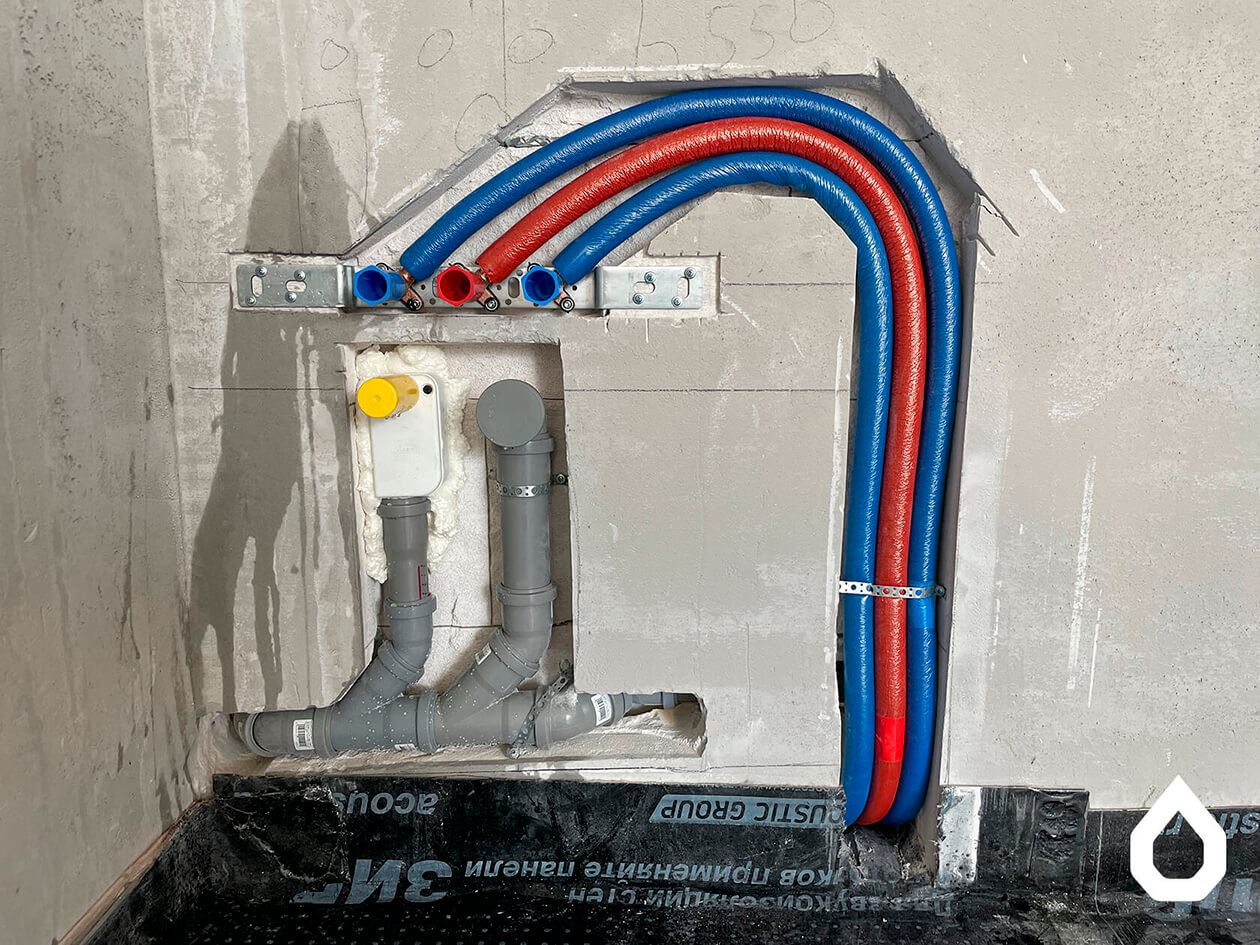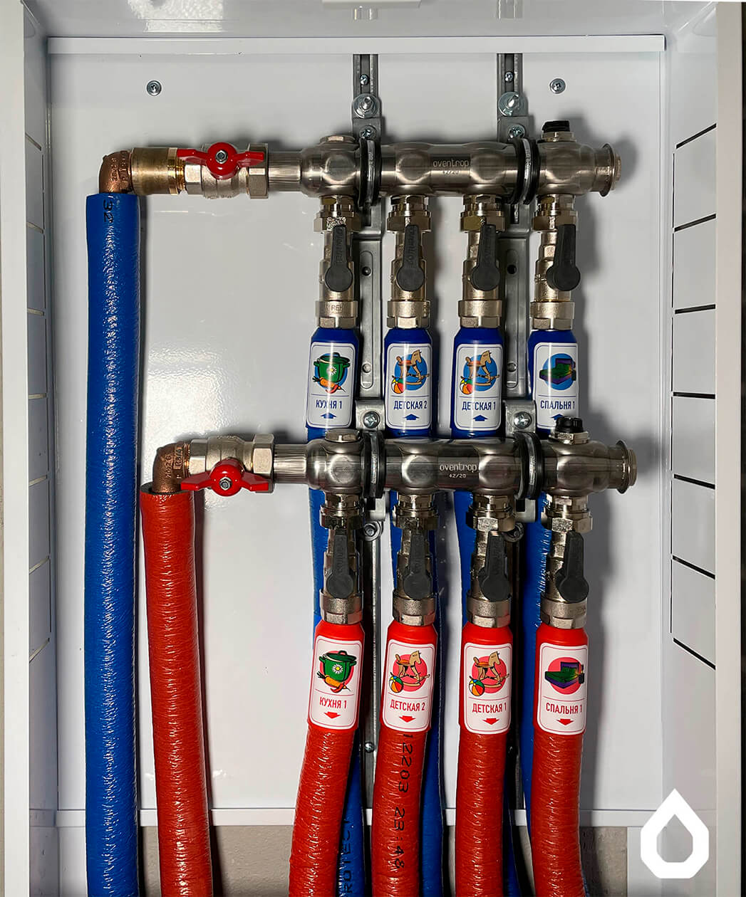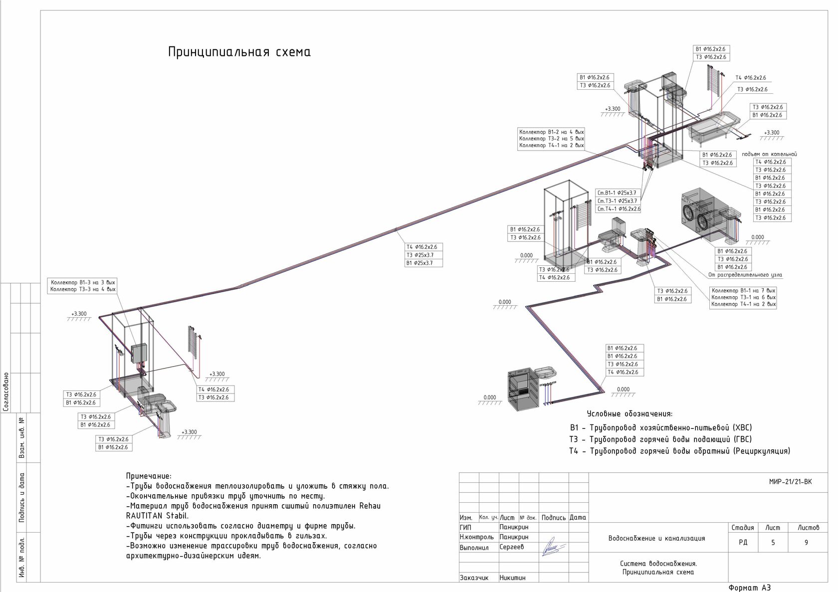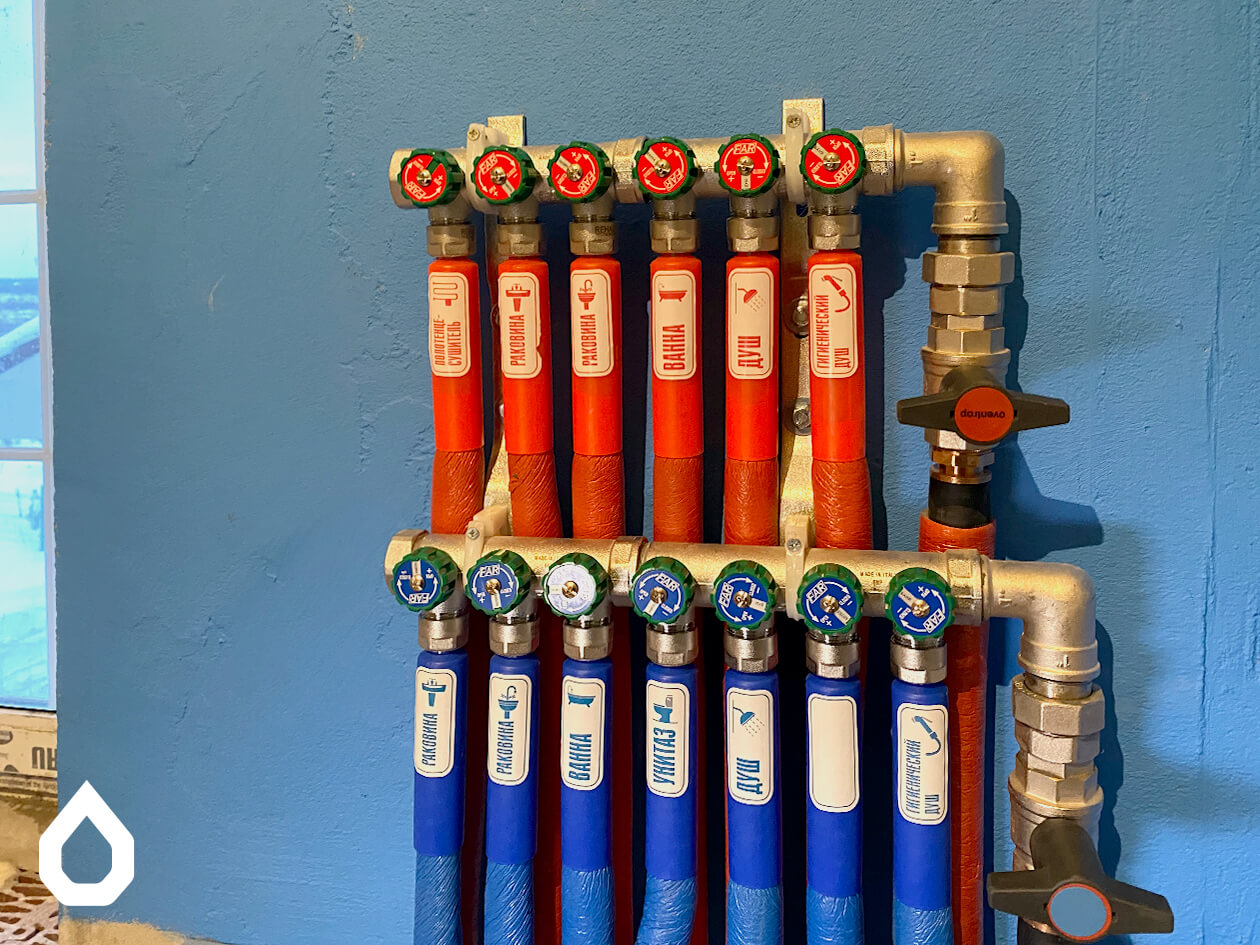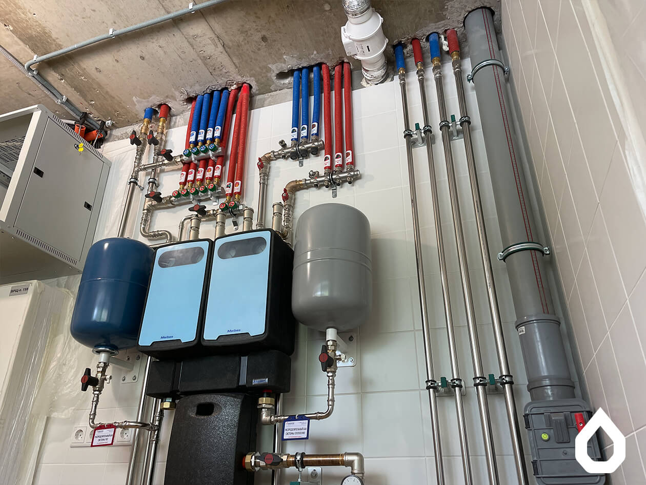 Проект водоснабжения включает в себя распределительные коллекторы и трубопроводы водоразбора. Узлы ввода и распределения стоят в инженерных каналах. На вводе следующие элементы: шаровый кран, комплект защиты от протечки, фильтр грубой очистки, редуктор давления, счетчик водяной, обратный клапан и фильтр тонкой очистки. Материал труб — сшитый полиэтилен фирмы ТЕСЕ. Коллекторы ¾ × ¾ с выходами под евроконус. Канализация — PPs трубы Ostendorf и RAU-PP Rehau на стояках.