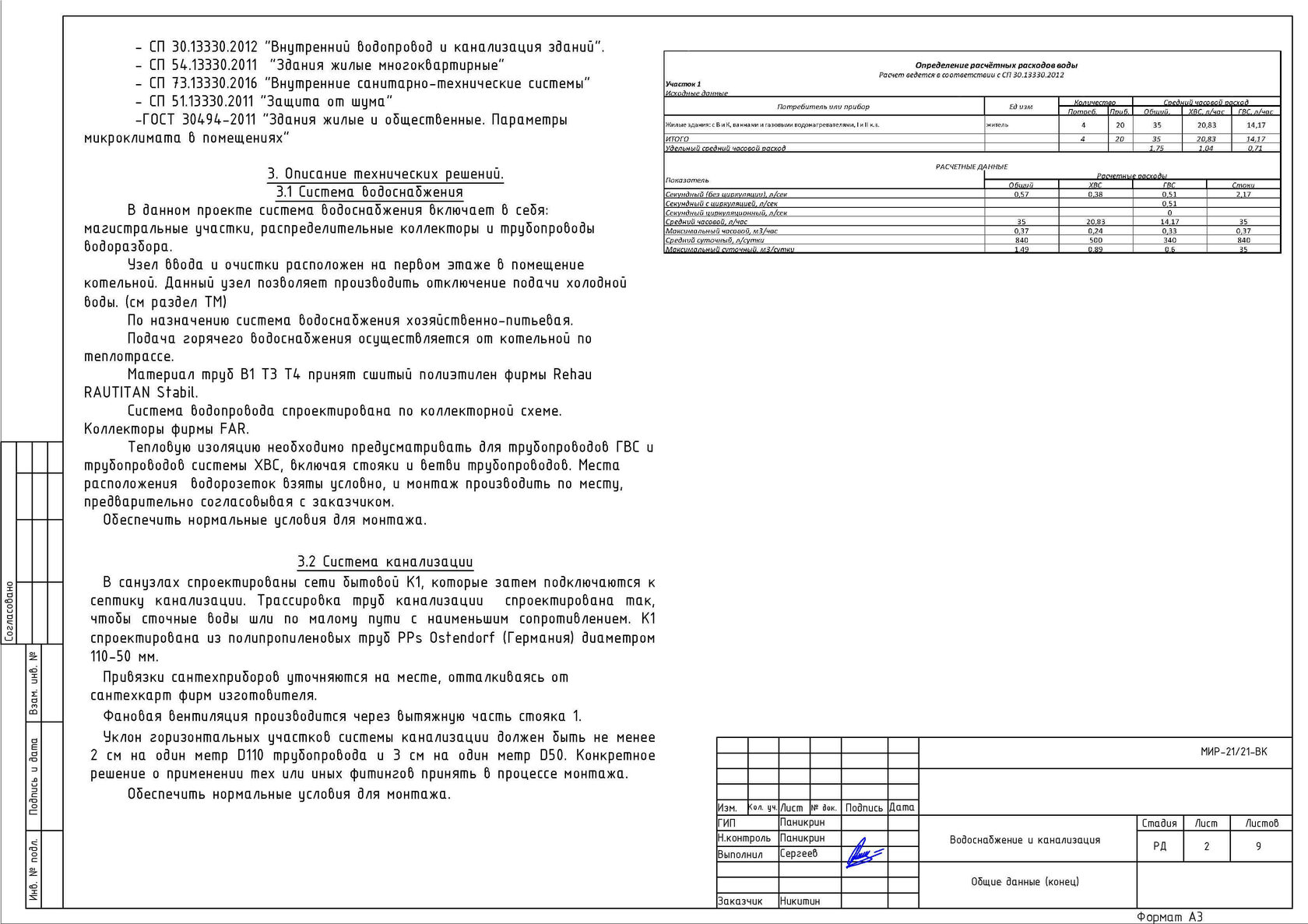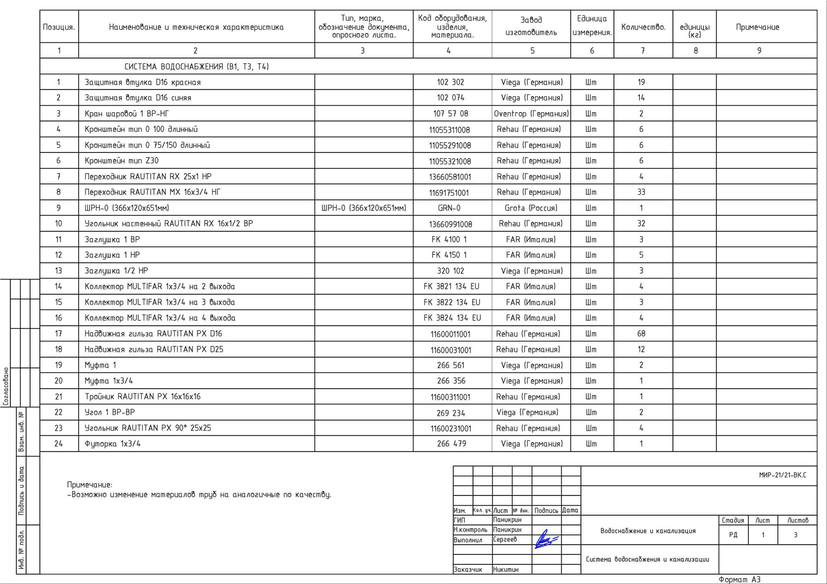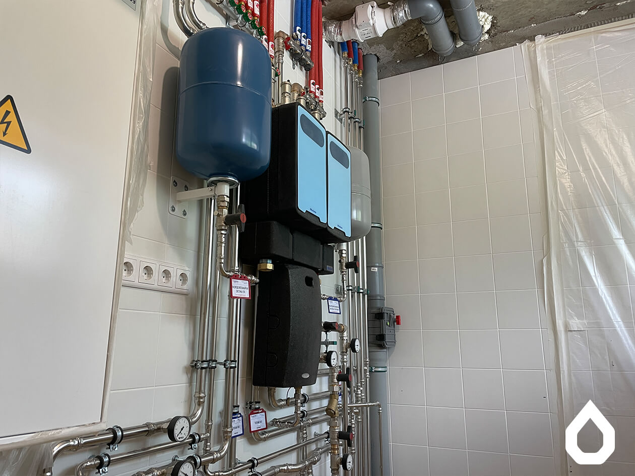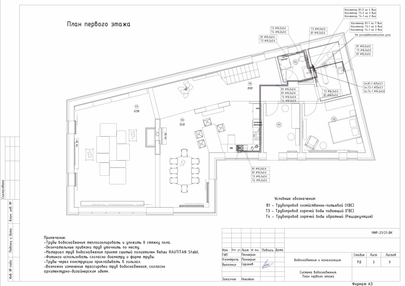 Проект водоснабжения включает в себя распределительные коллекторы и трубопроводы водоразбора. Узлы ввода и распределения стоят в инженерных каналах. На вводе следующие элементы: шаровый кран, комплект защиты от протечки, фильтр грубой очистки, редуктор давления, счетчик водяной, обратный клапан и фильтр тонкой очистки. Материал труб — сшитый полиэтилен фирмы ТЕСЕ. Коллекторы ¾ × ¾ с выходами под евроконус. Канализация — PPs трубы Ostendorf и RAU-PP Rehau на стояках.