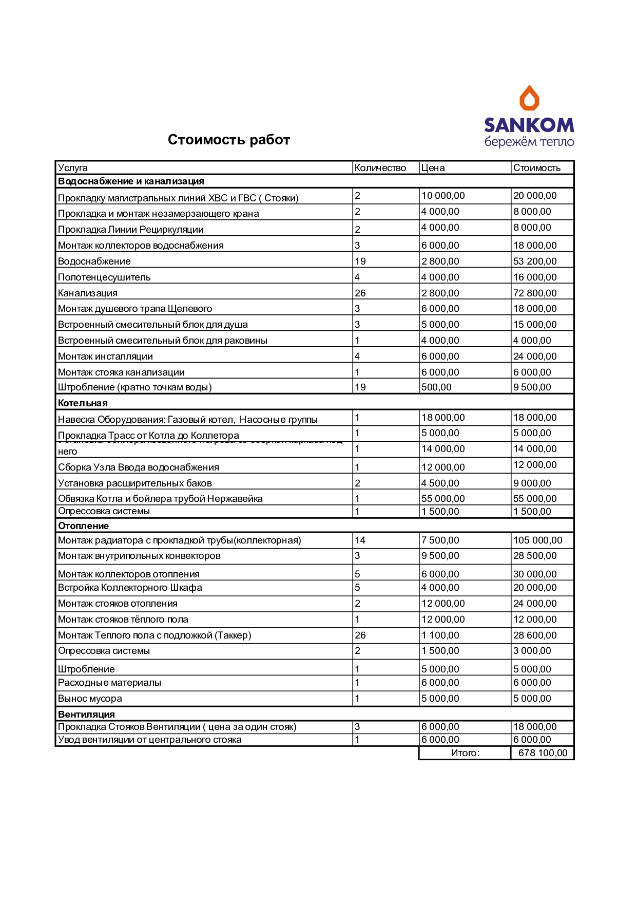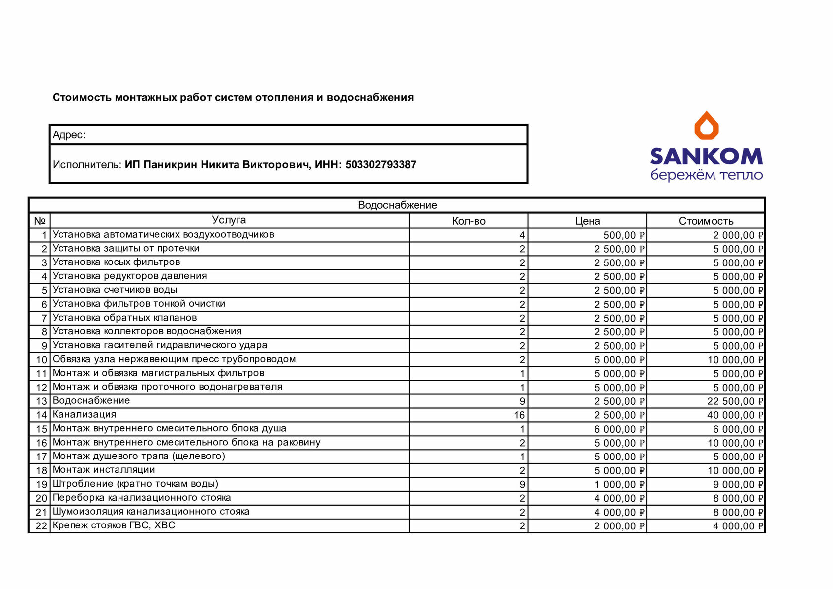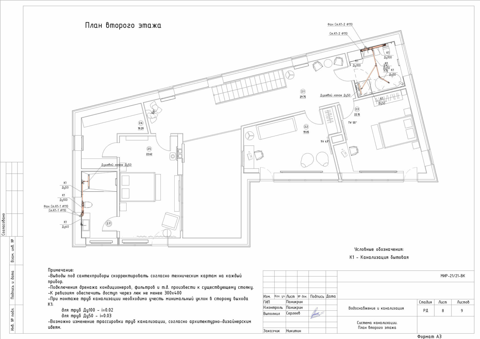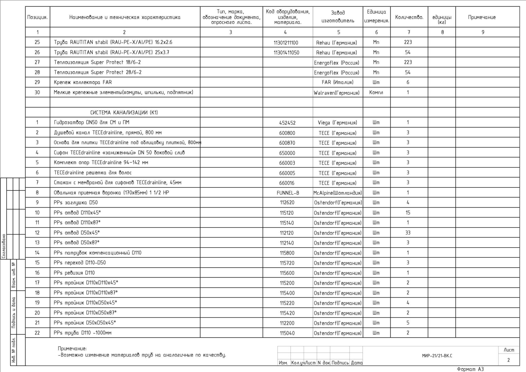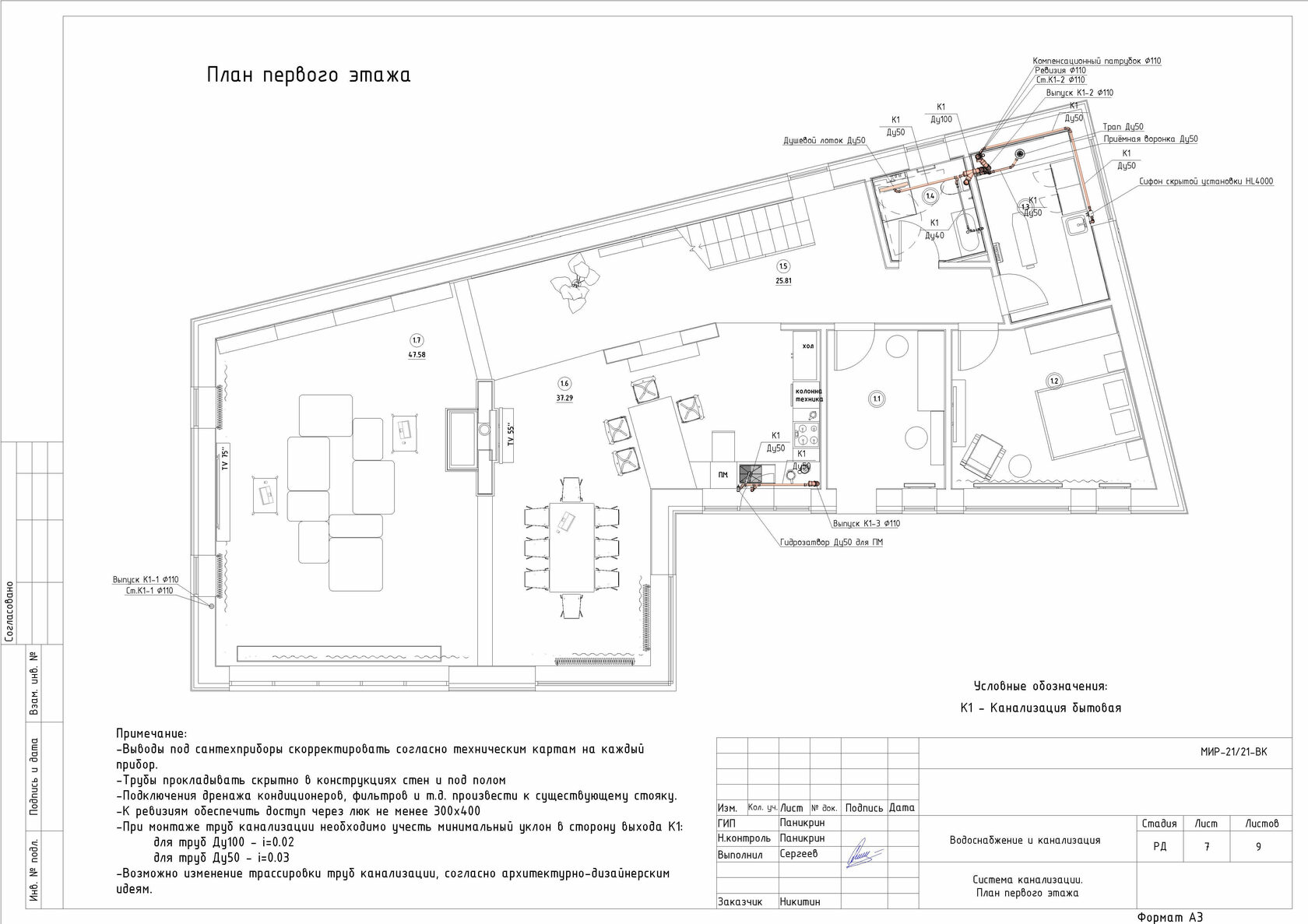 Проект водоснабжения включает в себя распределительные коллекторы и трубопроводы водоразбора. Узлы ввода и распределения стоят в инженерных каналах. На вводе следующие элементы: шаровый кран, комплект защиты от протечки, фильтр грубой очистки, редуктор давления, счетчик водяной, обратный клапан и фильтр тонкой очистки. Материал труб — сшитый полиэтилен фирмы ТЕСЕ. Коллекторы ¾ × ¾ с выходами под евроконус. Канализация — PPs трубы Ostendorf и RAU-PP Rehau на стояках.