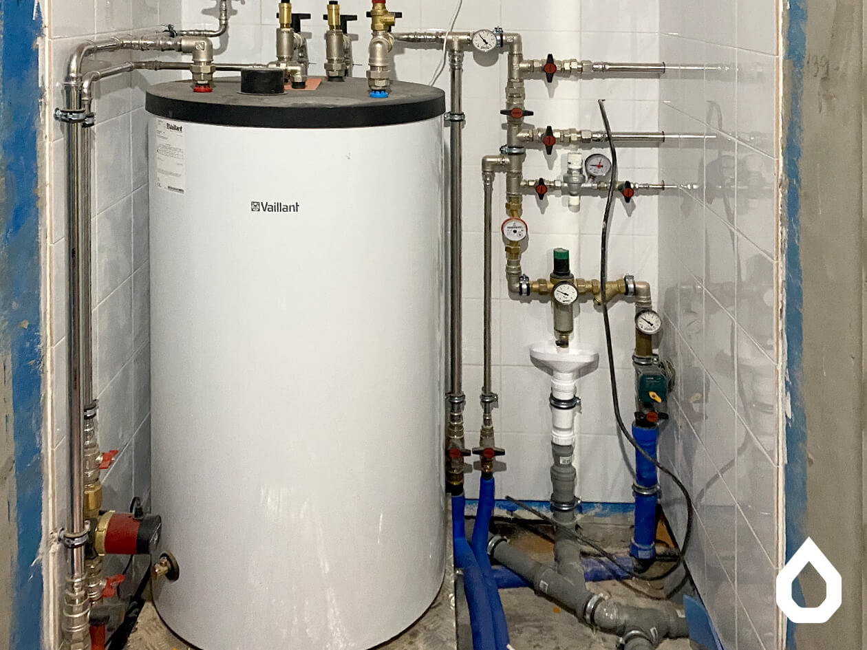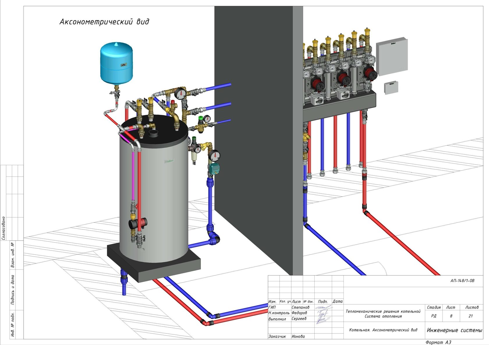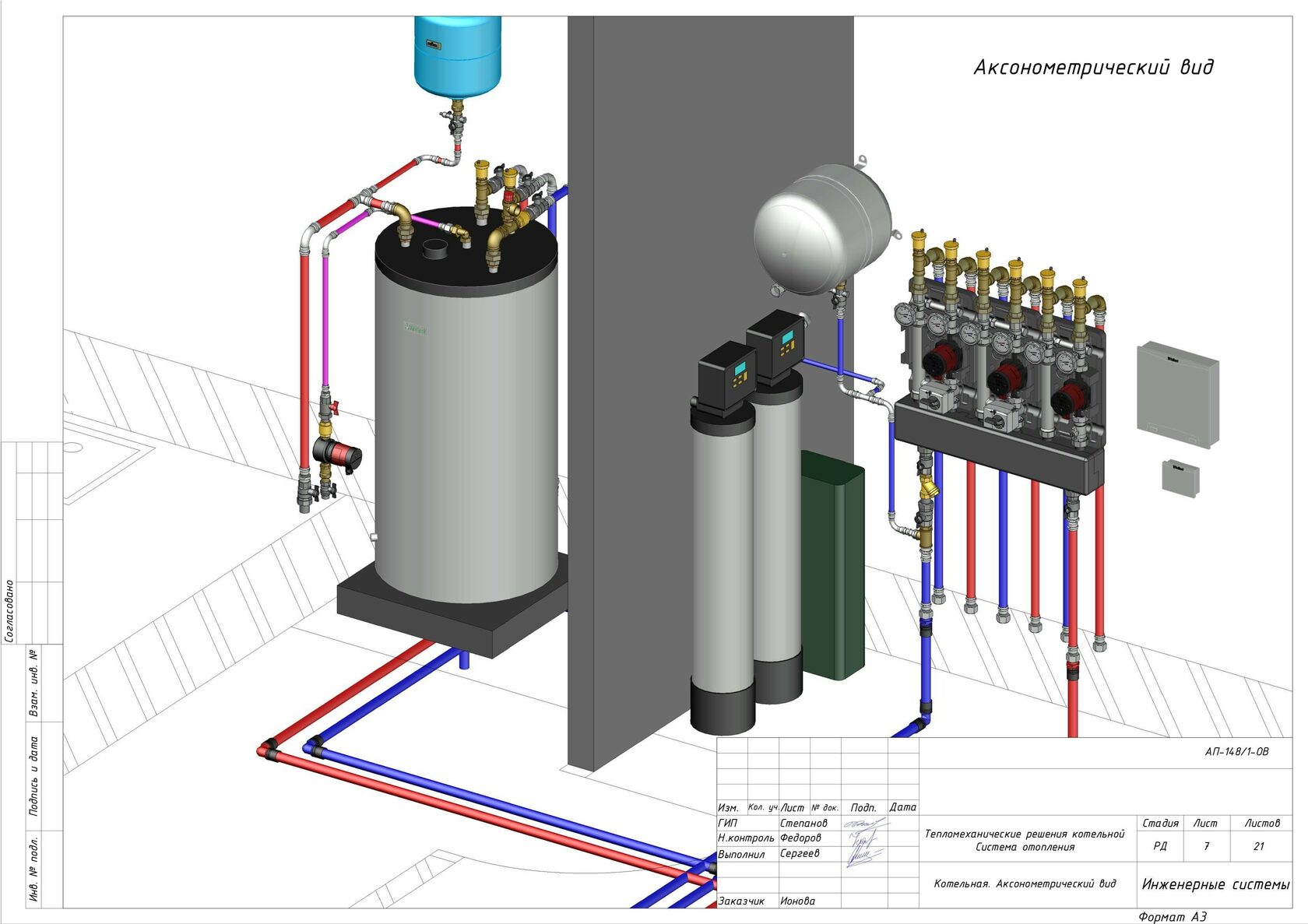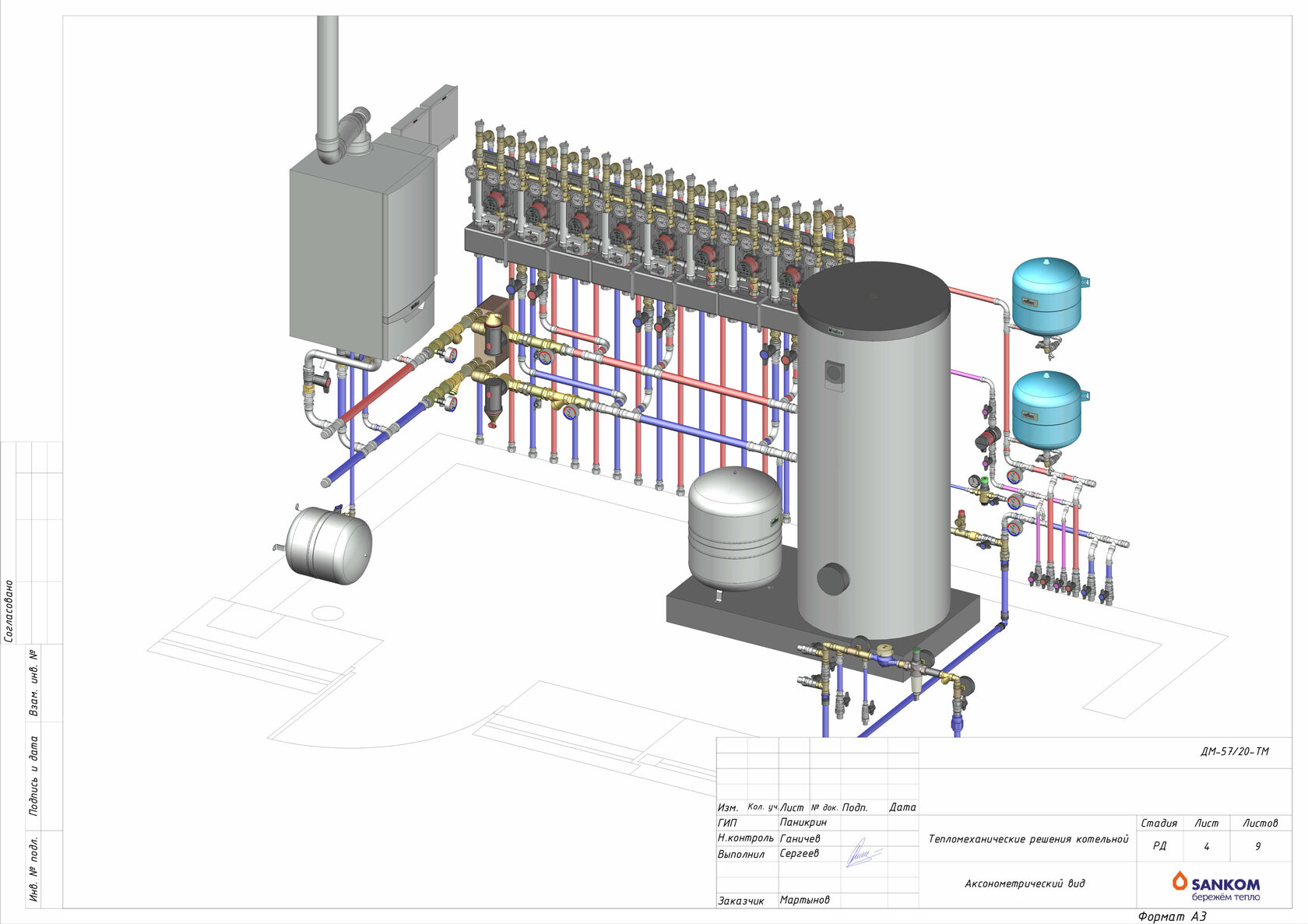Поставлен одноконтурный газовый котёл Viessmann Vitopend 100-W на 24 кВт. В котле встроен насос с объёмом до 1200 л/ч и напором до 4 м вод. ст., который отвечает за подачу теплоносителя в котловой контур и контур загрузки бойлера. Отопление смешанное — радиаторное плюс тёплый пол. Пол работает от насосной группы с термостатическим смесителем. Для тепловых расширений жидкости предусмотрен бак мембранного типа Reflex NG 18 л.