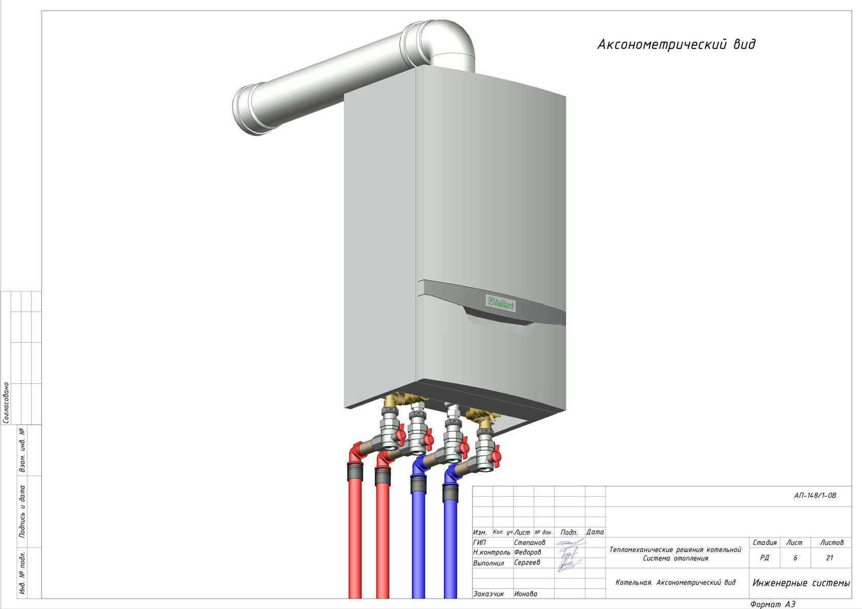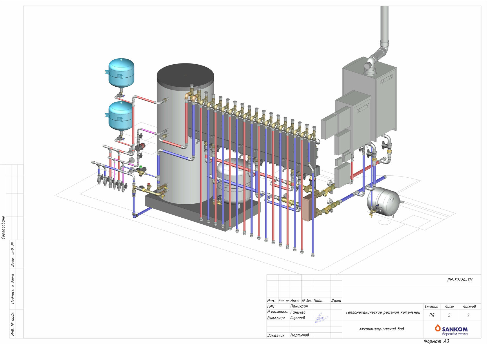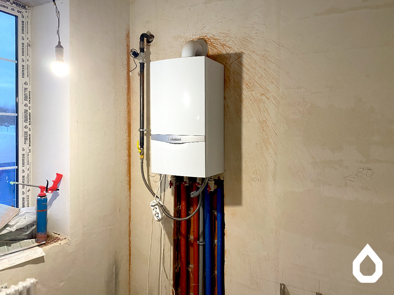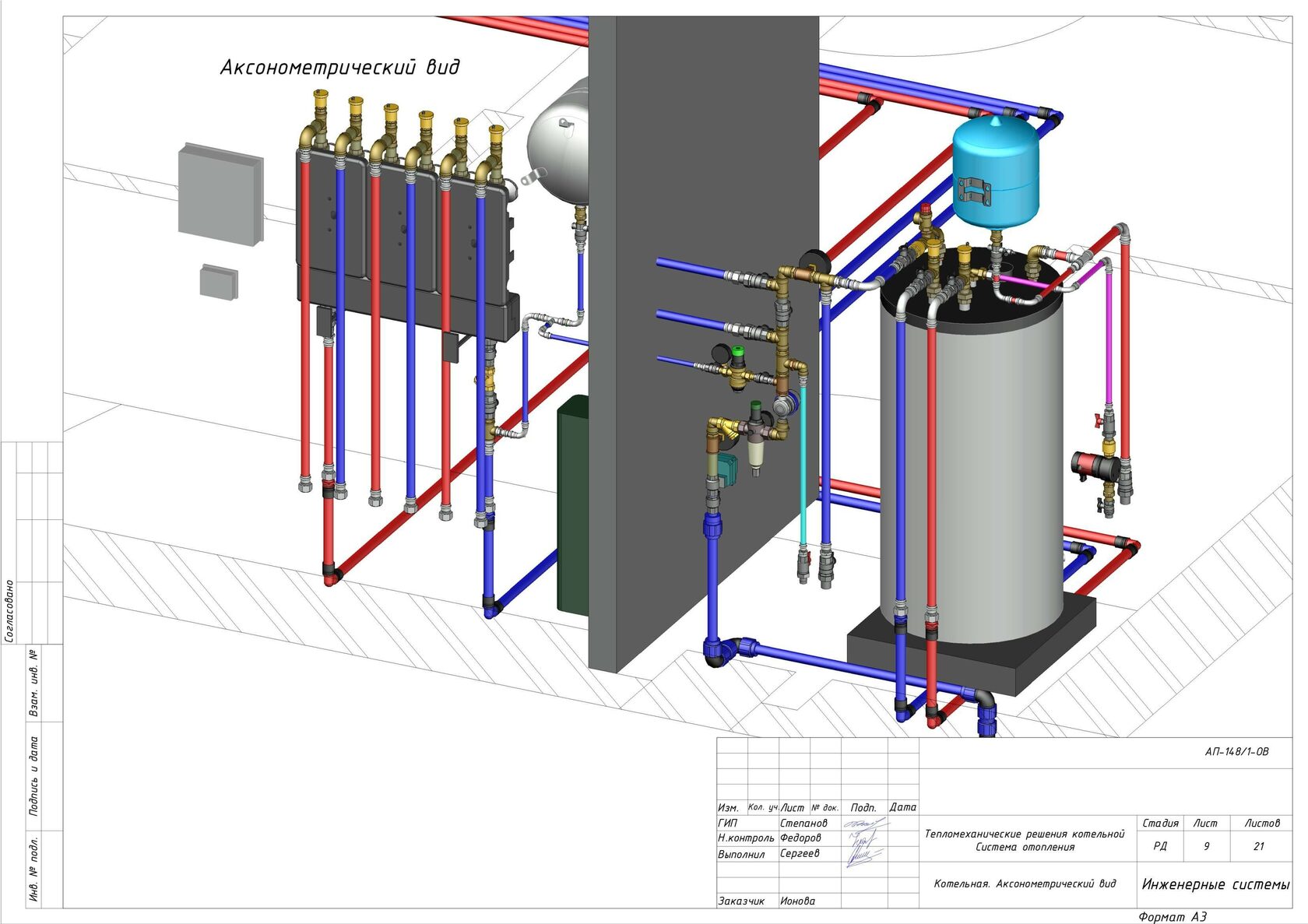 Поставлен одноконтурный газовый котёл Viessmann Vitopend 100-W на 24 кВт. В котле встроен насос с объёмом до 1200 л/ч и напором до 4 м вод. ст., который отвечает за подачу теплоносителя в котловой контур и контур загрузки бойлера. Отопление смешанное — радиаторное плюс тёплый пол. Пол работает от насосной группы с термостатическим смесителем. Для тепловых расширений жидкости предусмотрен бак мембранного типа Reflex NG 18 л.
