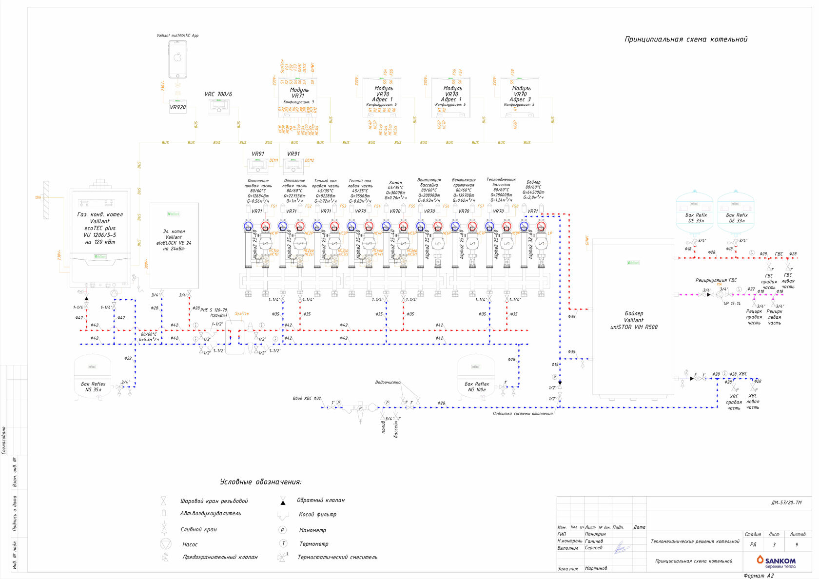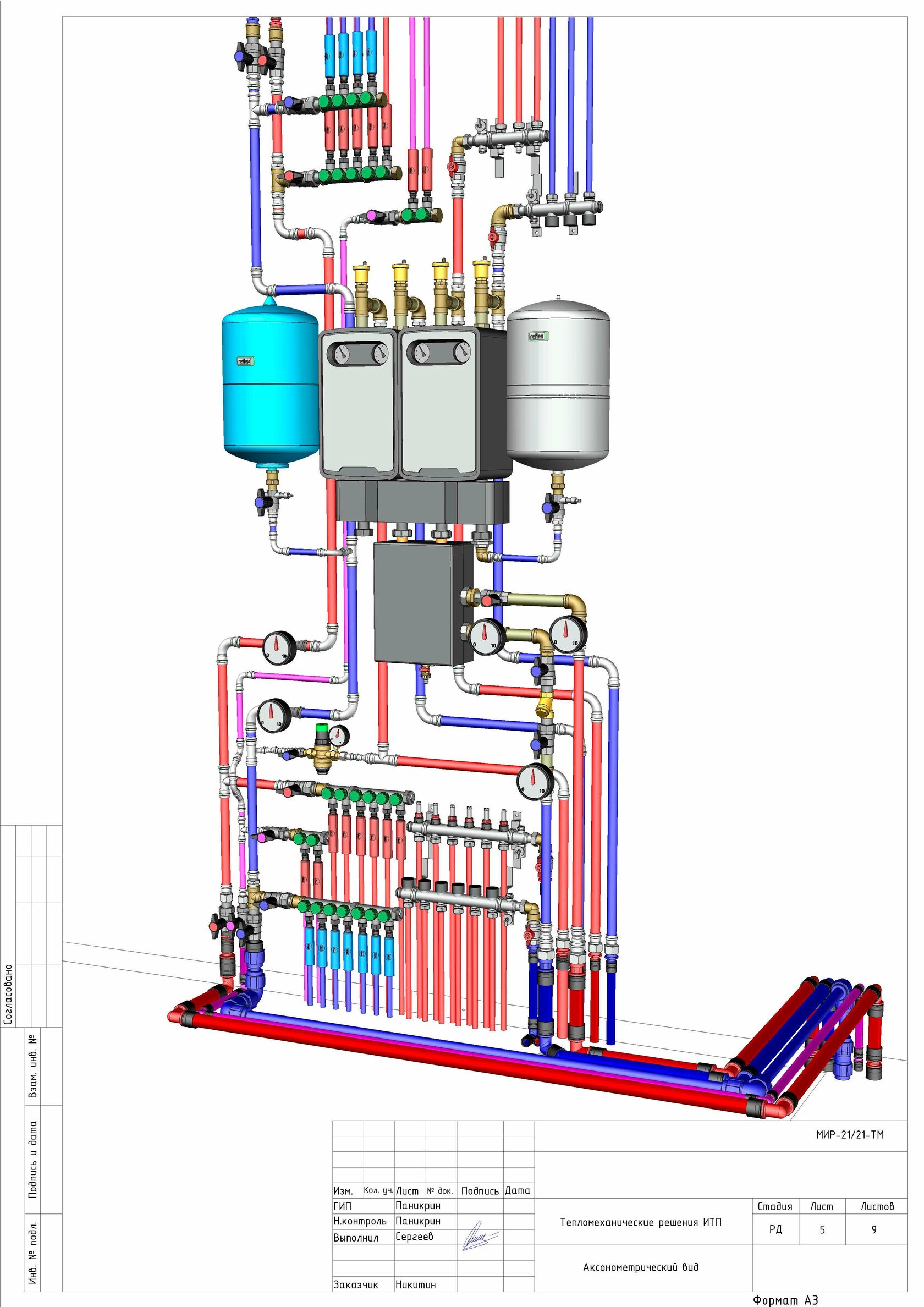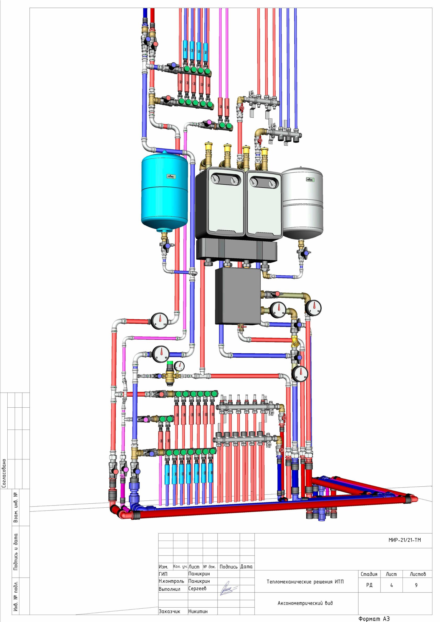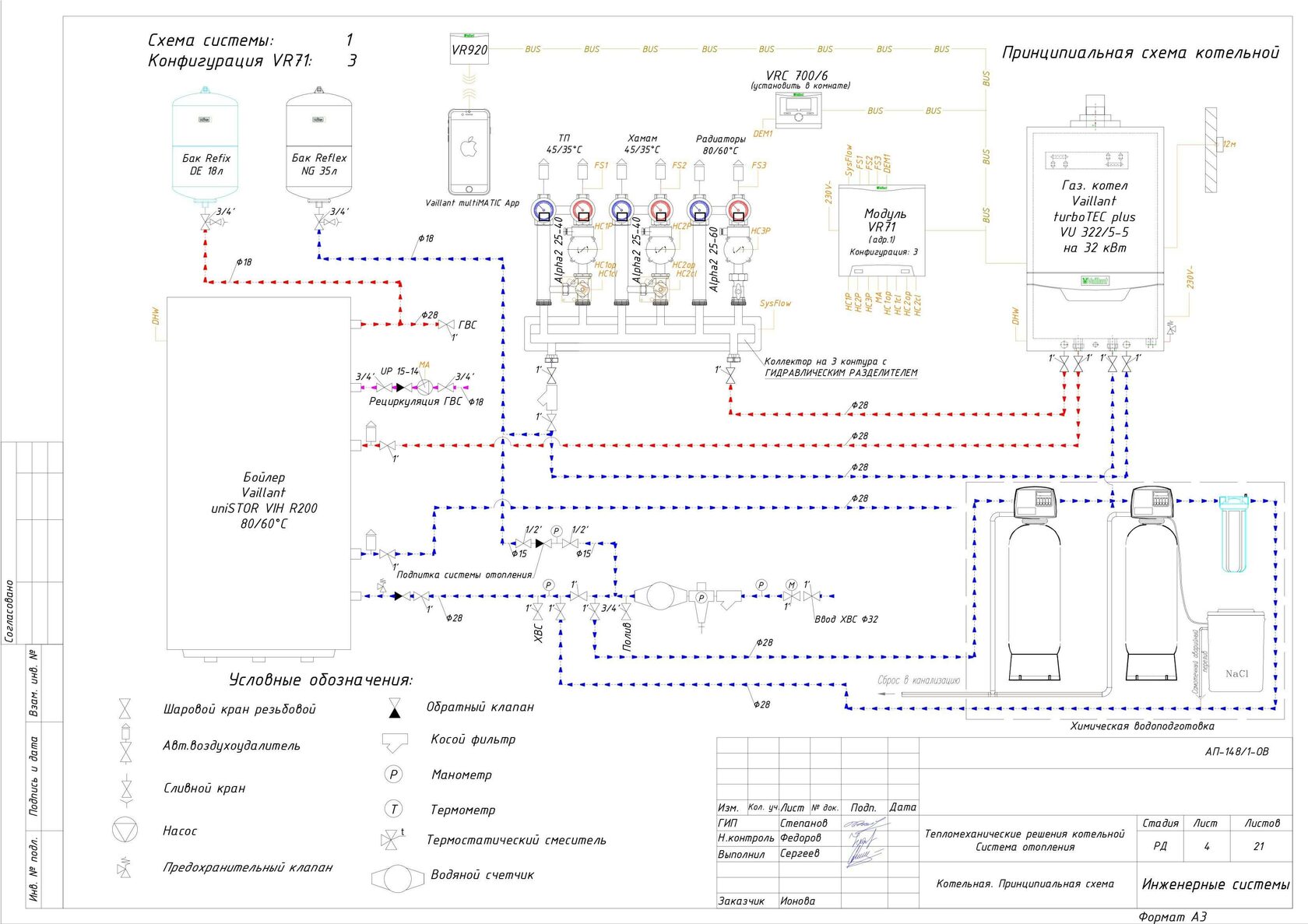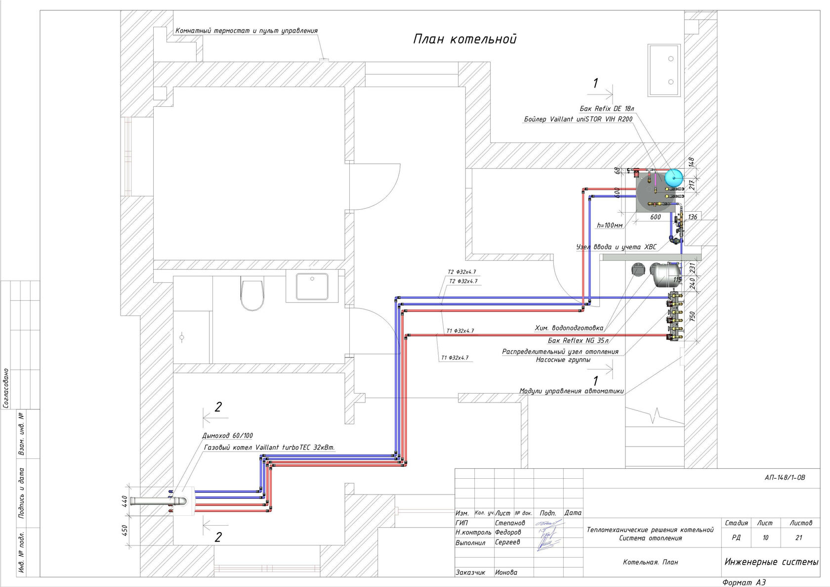 Поставлен одноконтурный газовый котёл Viessmann Vitopend 100-W на 24 кВт. В котле встроен насос с объёмом до 1200 л/ч и напором до 4 м вод. ст., который отвечает за подачу теплоносителя в котловой контур и контур загрузки бойлера. Отопление смешанное — радиаторное плюс тёплый пол. Пол работает от насосной группы с термостатическим смесителем. Для тепловых расширений жидкости предусмотрен бак мембранного типа Reflex NG 18 л.