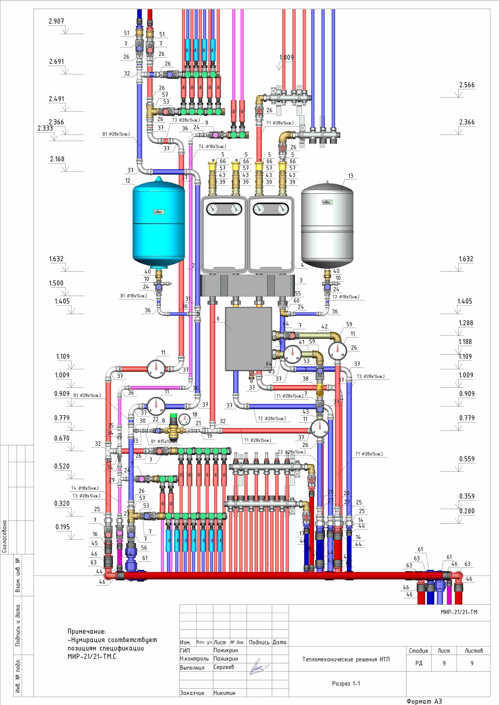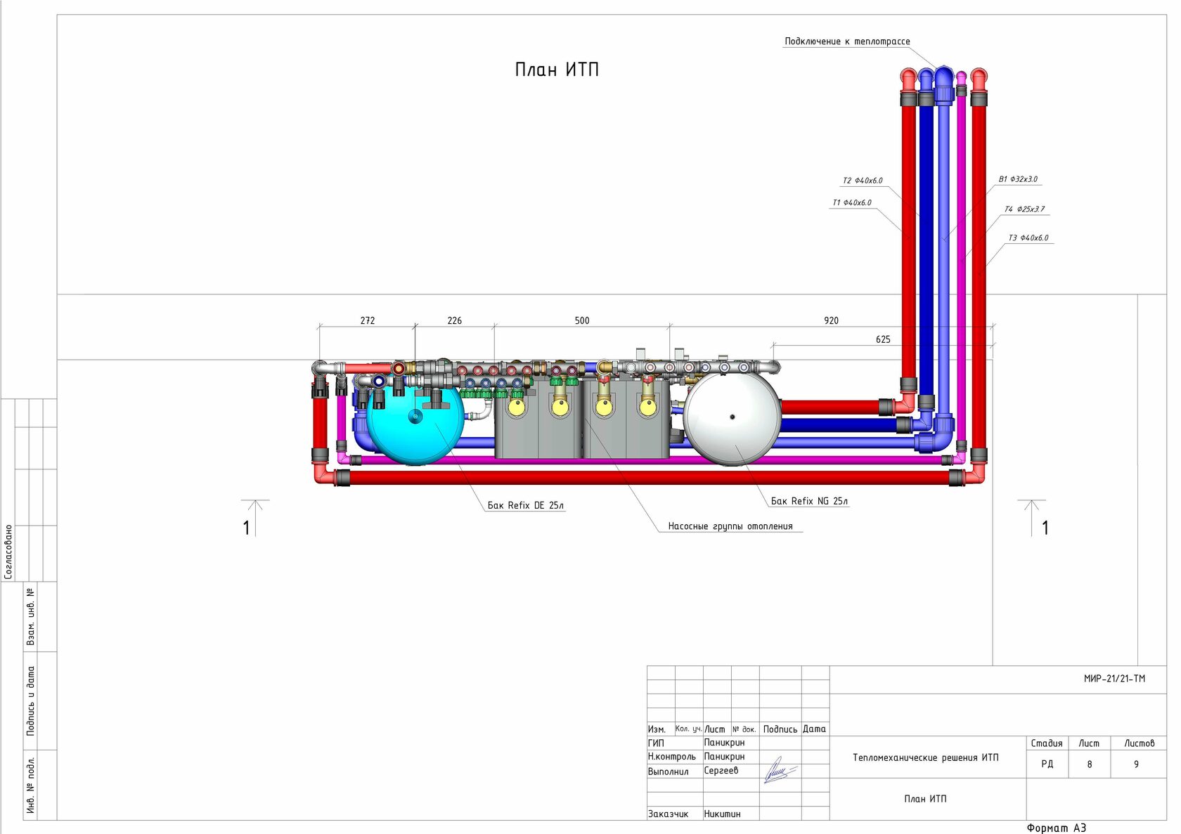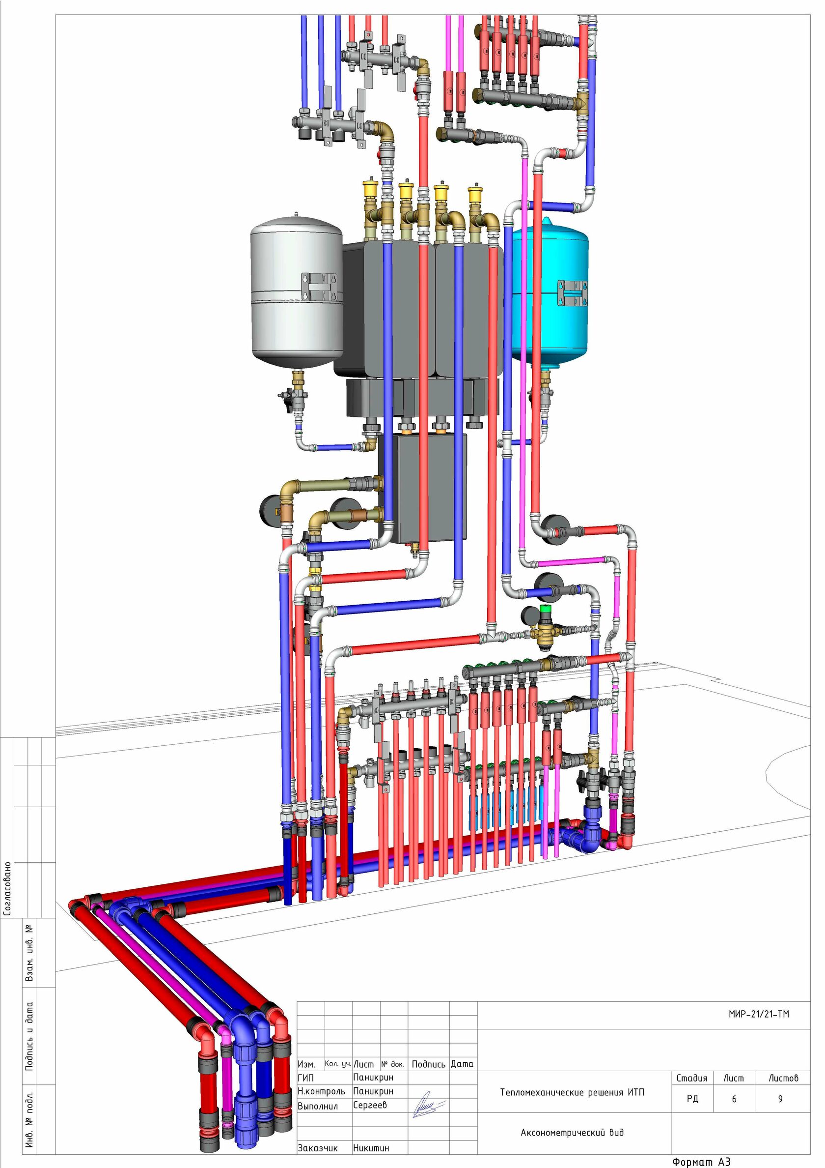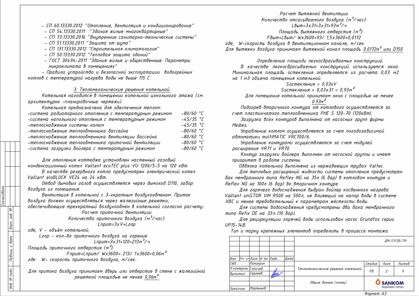 Поставлен одноконтурный газовый котёл Viessmann Vitopend 100-W на 24 кВт. В котле встроен насос с объёмом до 1200 л/ч и напором до 4 м вод. ст., который отвечает за подачу теплоносителя в котловой контур и контур загрузки бойлера. Отопление смешанное — радиаторное плюс тёплый пол. Пол работает от насосной группы с термостатическим смесителем. Для тепловых расширений жидкости предусмотрен бак мембранного типа Reflex NG 18 л.