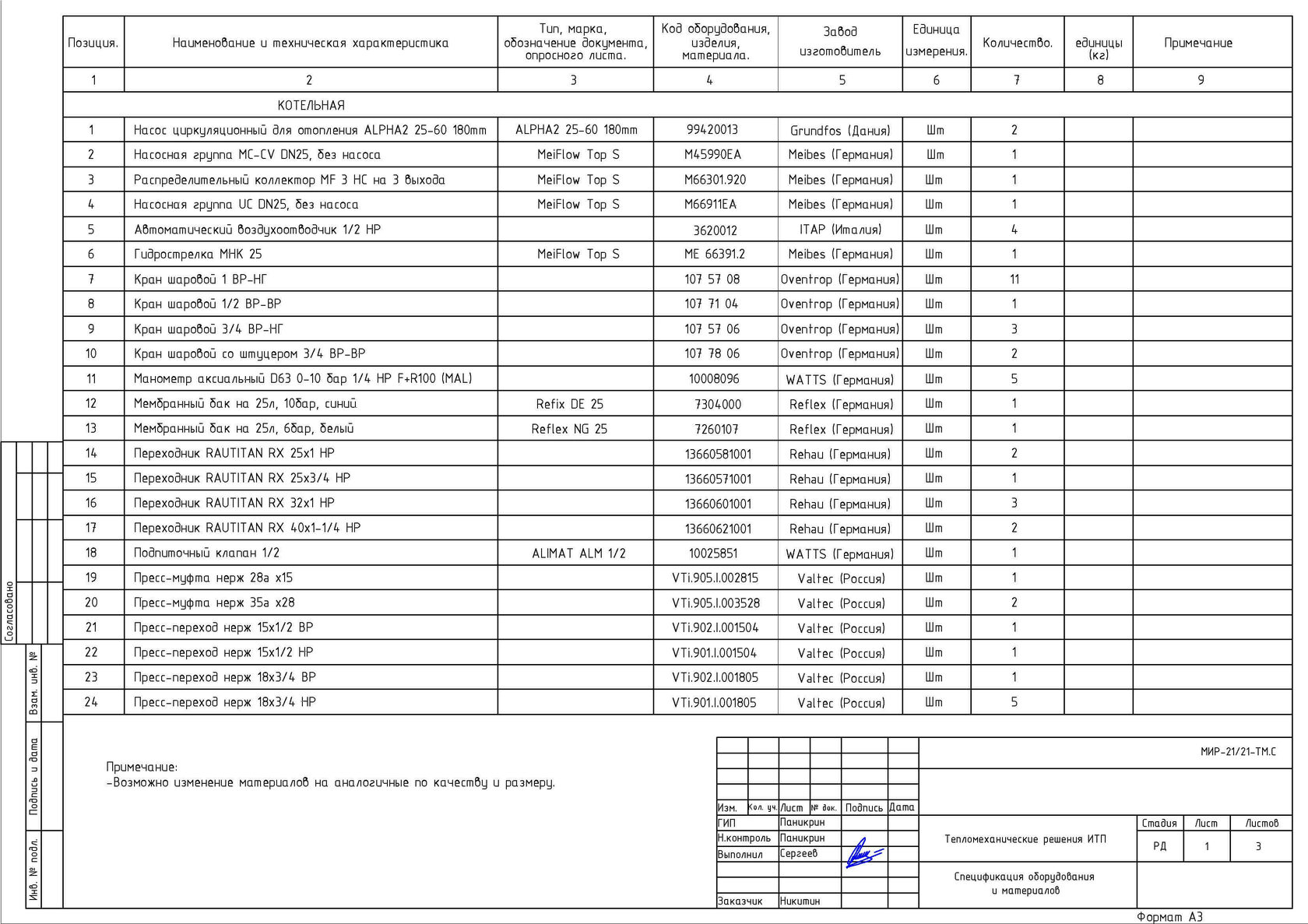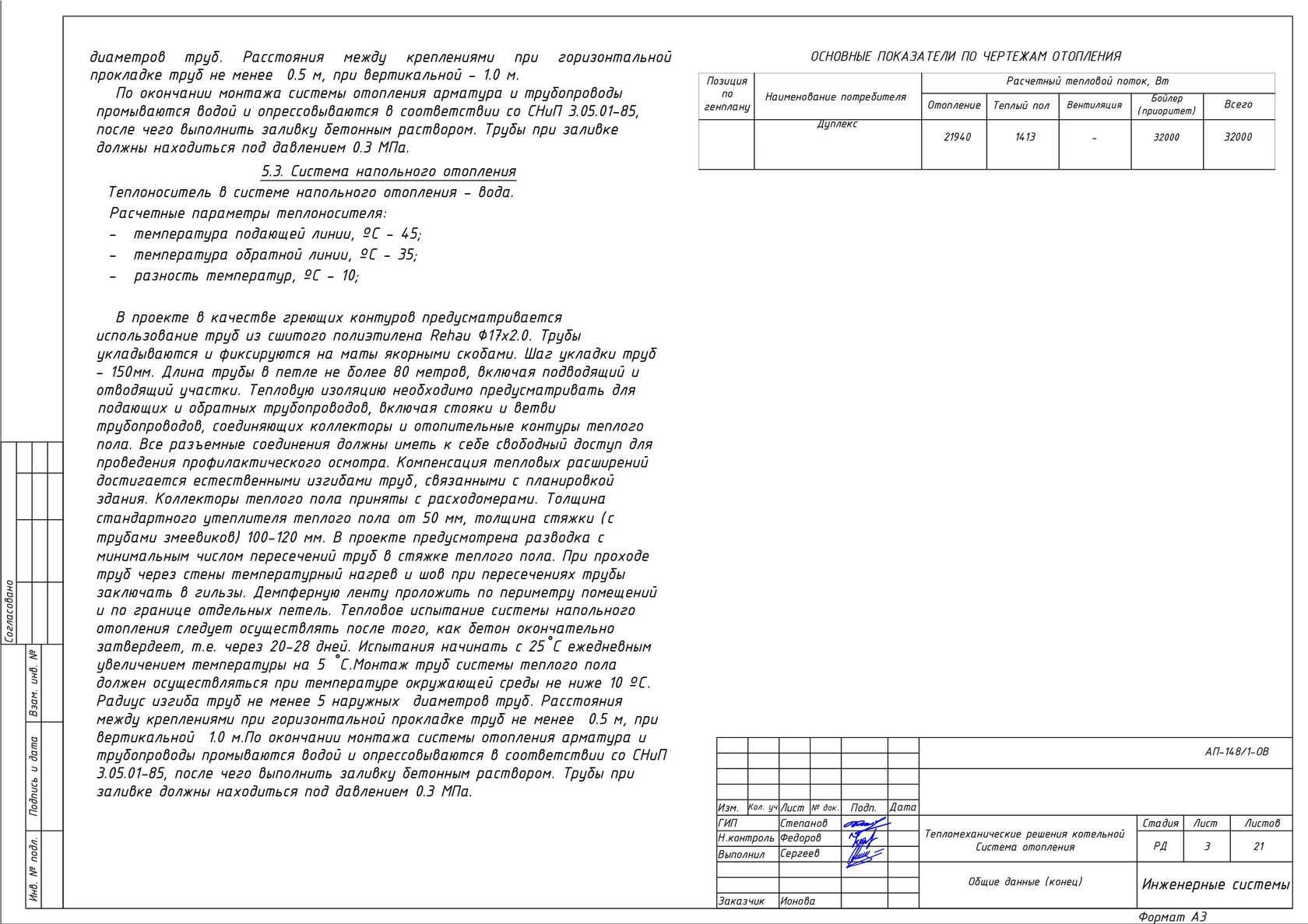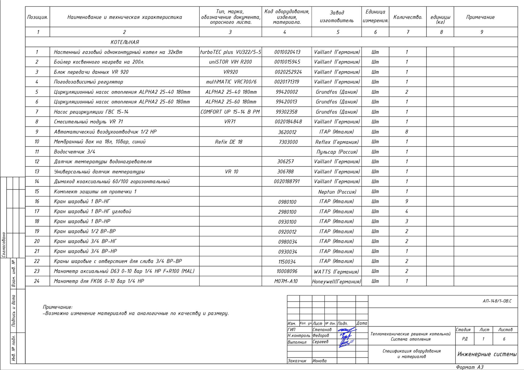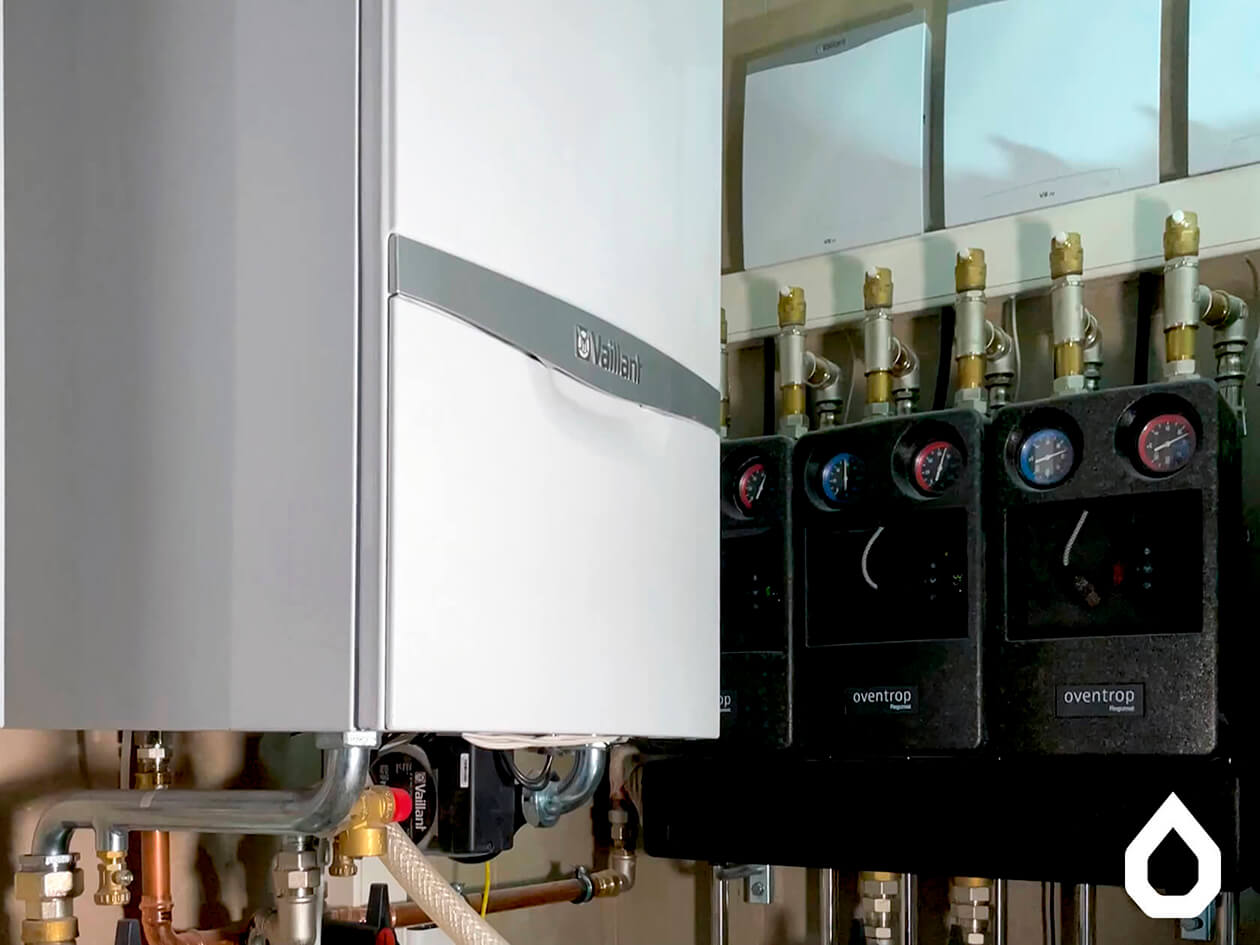Поставлен одноконтурный газовый котёл Viessmann Vitopend 100-W на 24 кВт. В котле встроен насос с объёмом до 1200 л/ч и напором до 4 м вод. ст., который отвечает за подачу теплоносителя в котловой контур и контур загрузки бойлера. Отопление смешанное — радиаторное плюс тёплый пол. Пол работает от насосной группы с термостатическим смесителем. Для тепловых расширений жидкости предусмотрен бак мембранного типа Reflex NG 18 л.