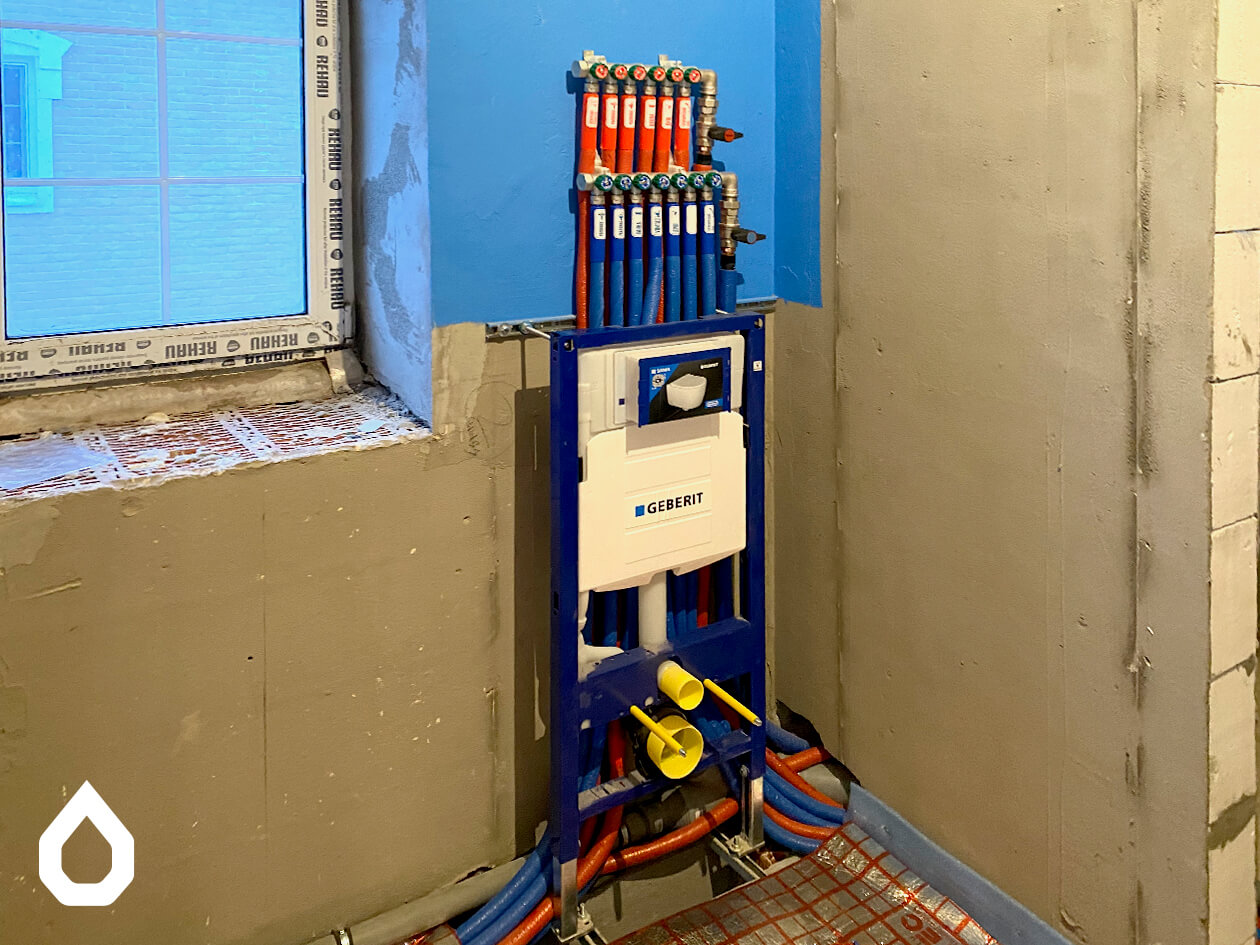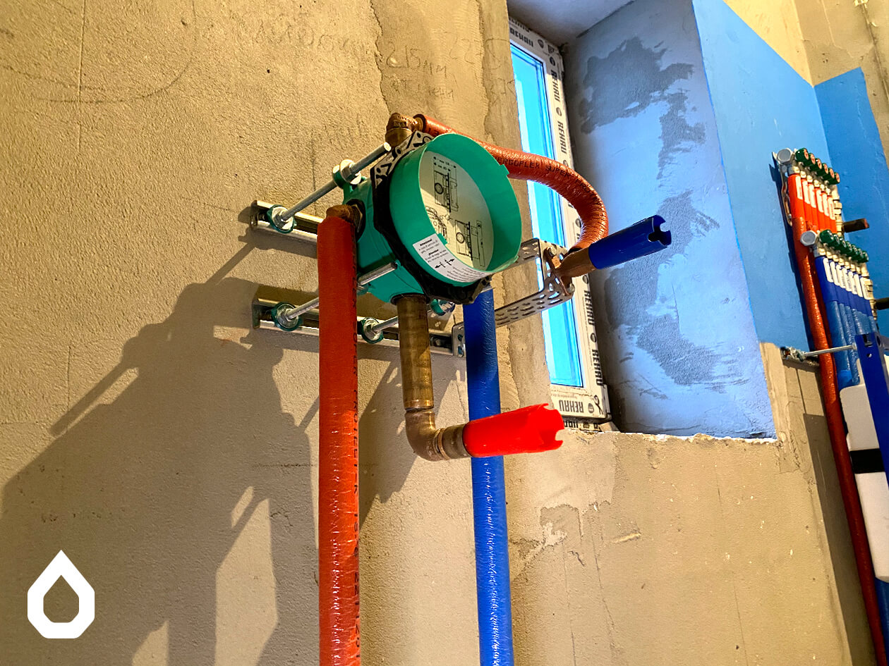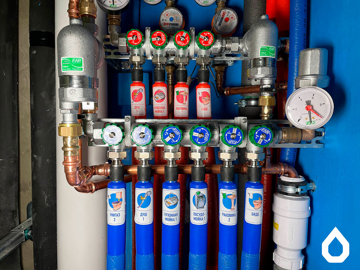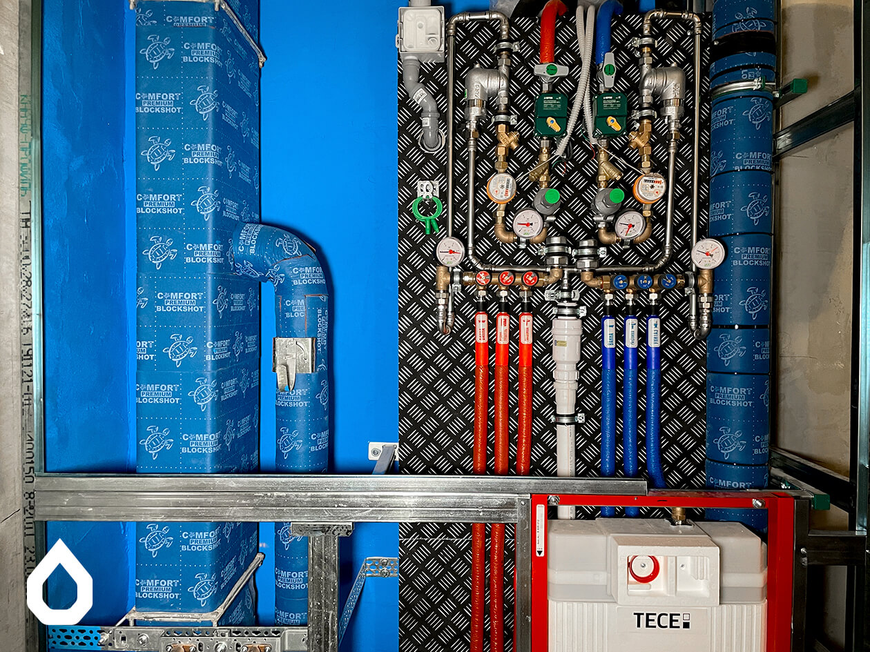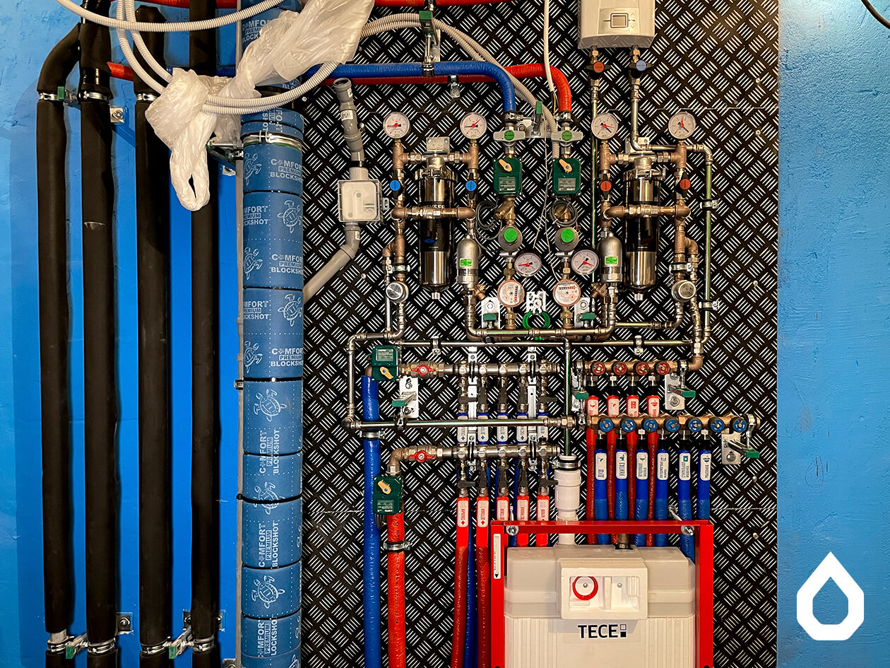На узле ввода всё как мы любим — шаровый кран Oventrop «Optibal», защита от протечки Neptun, косой фильтр ITAP, редуктор давления FAR ВР-ВР с манометром, обратный клапан ITAP и фильтр тонкой очистки FAR. Поставили трубы ТЕСЕ и Rehau «RAUTITAN stabil». Коллекторы — FAR «MULTIFAR» 1 × ¾. Канализация из Rehau и Ostendorf.