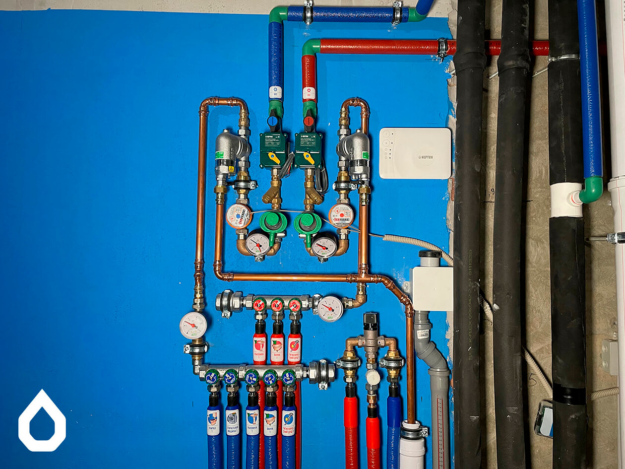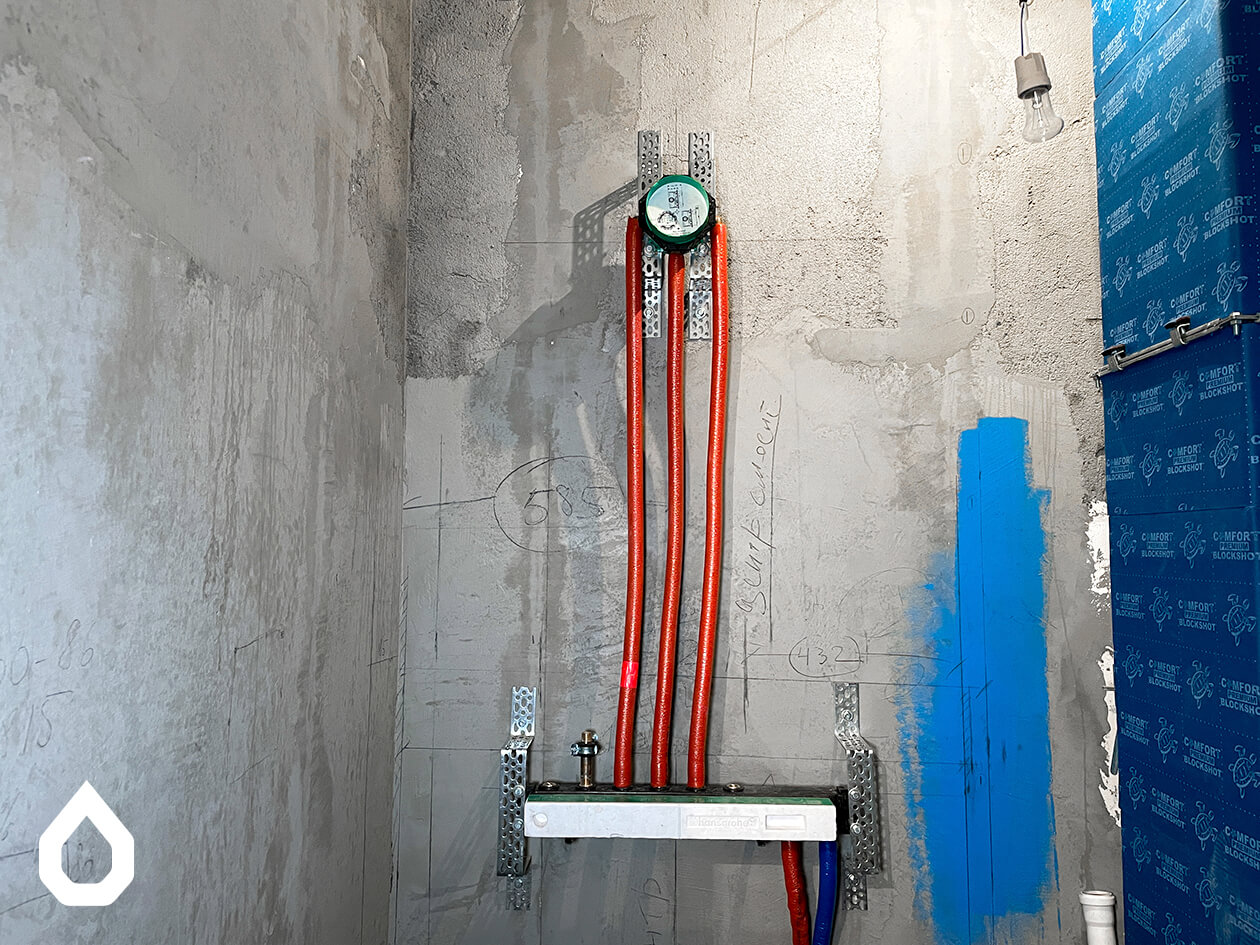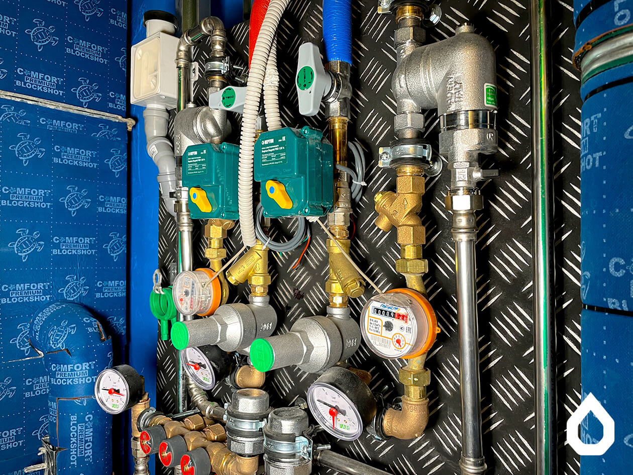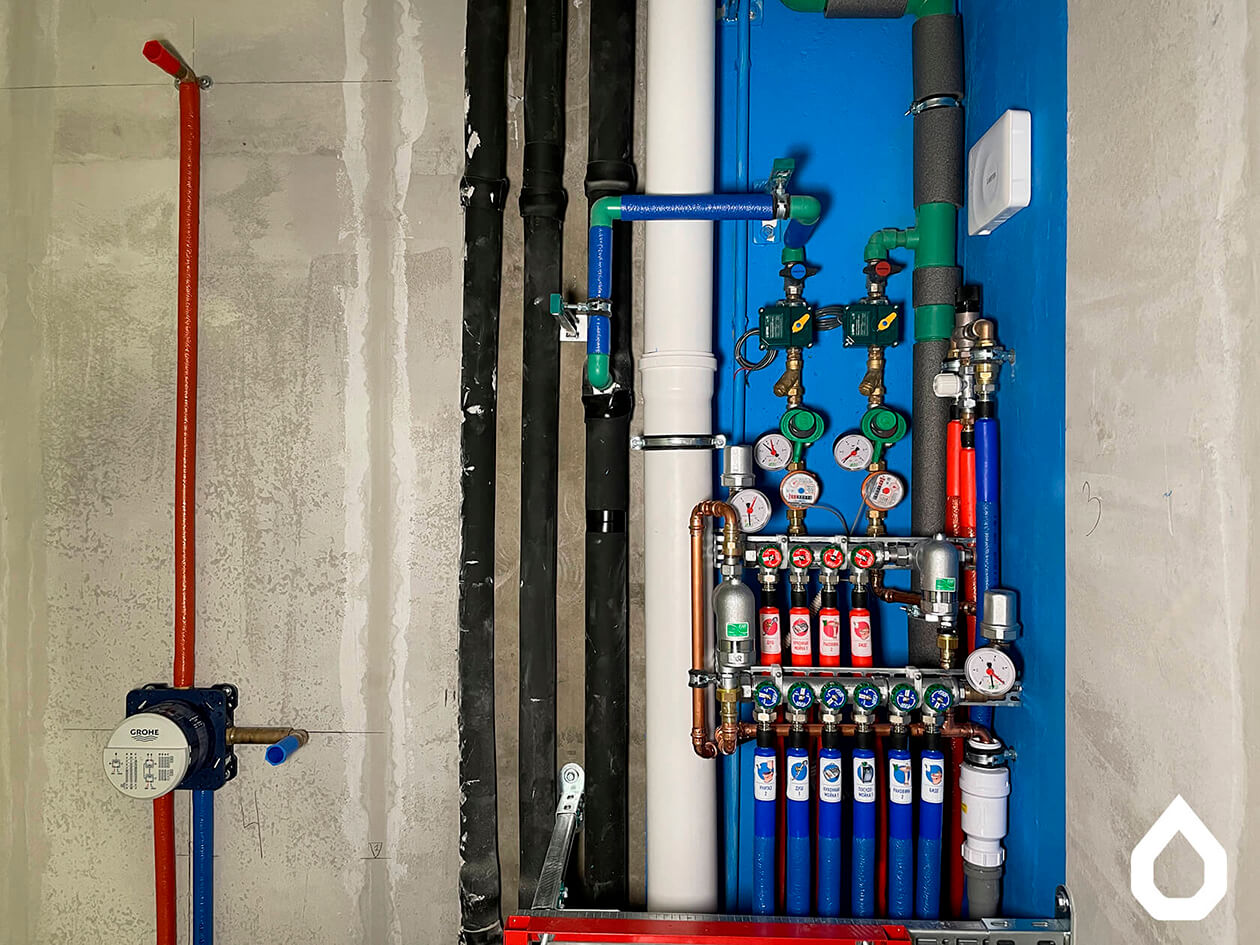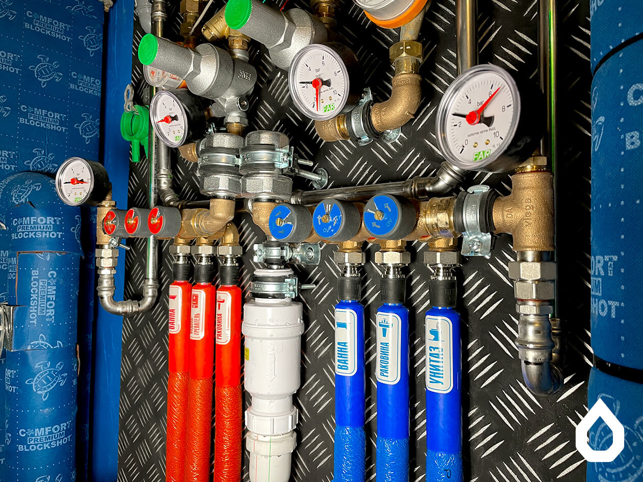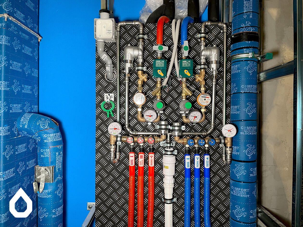 На узле ввода всё как мы любим — шаровый кран Oventrop «Optibal», защита от протечки Neptun, косой фильтр ITAP, редуктор давления FAR ВР-ВР с манометром, обратный клапан ITAP и фильтр тонкой очистки FAR. Поставили трубы ТЕСЕ и Rehau «RAUTITAN stabil». Коллекторы — FAR «MULTIFAR» 1 × ¾. Канализация из Rehau и Ostendorf.