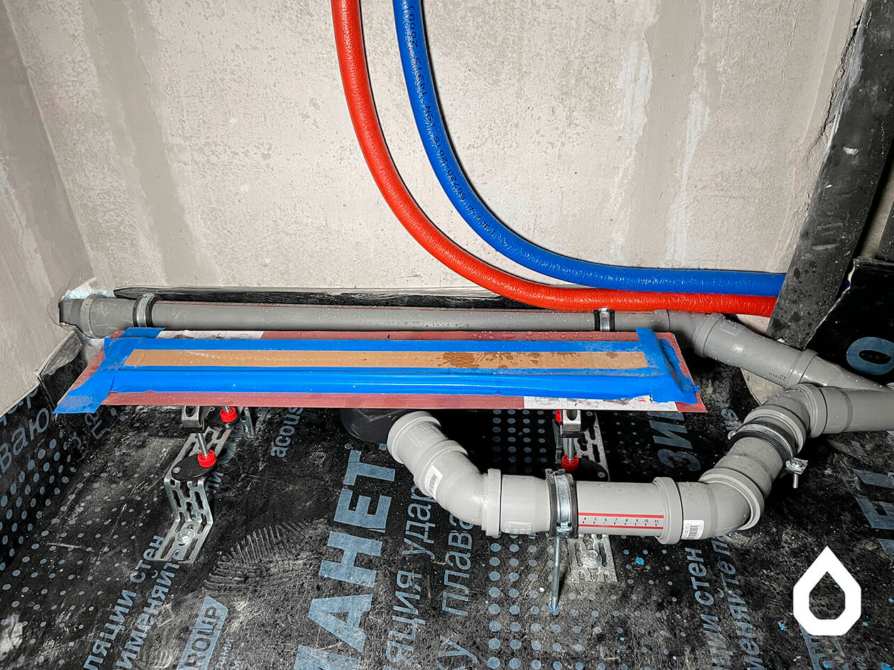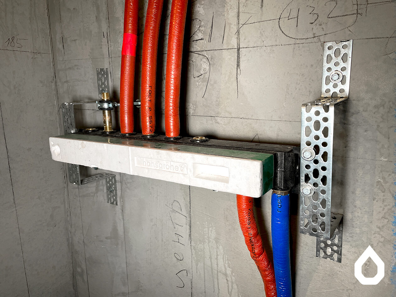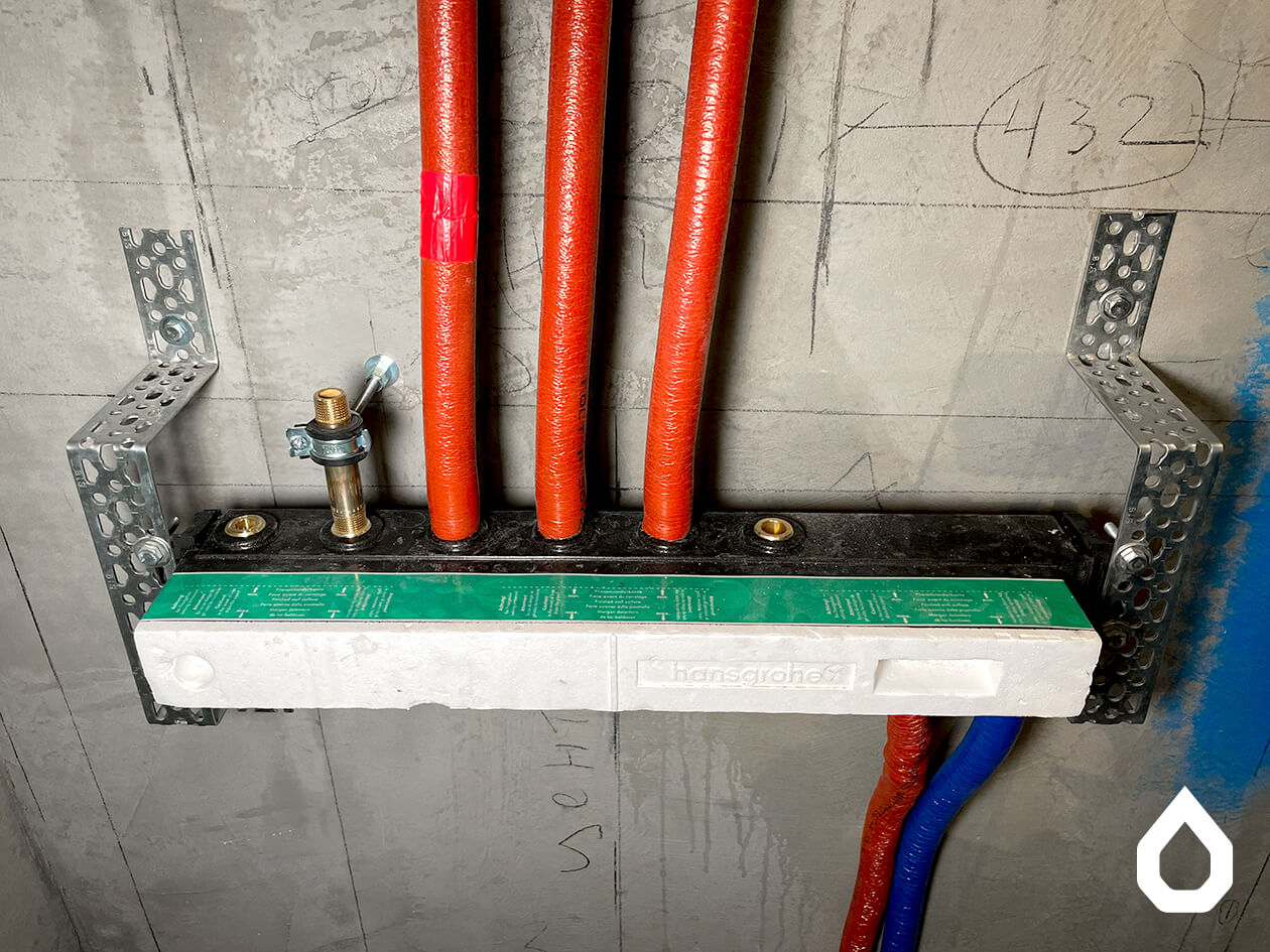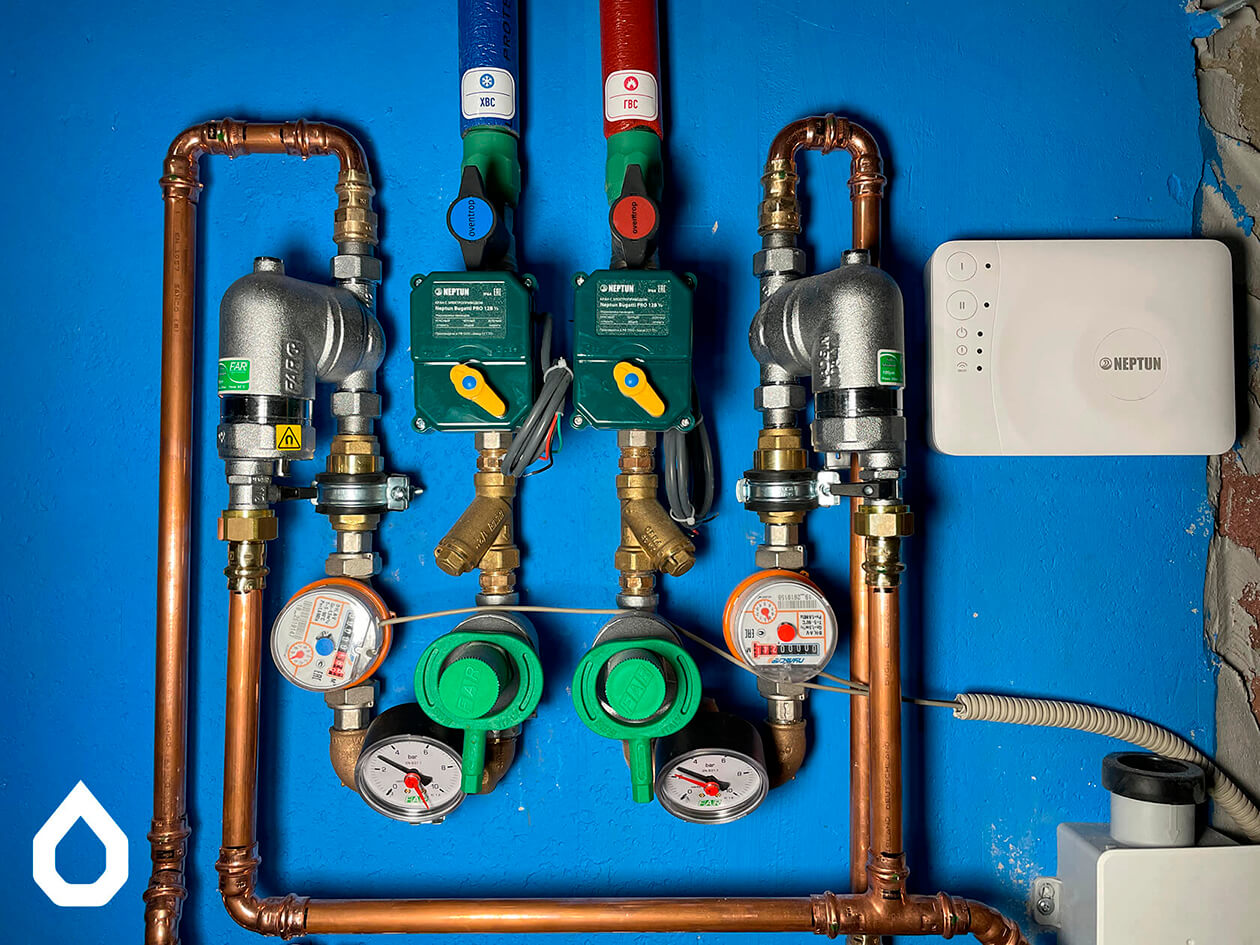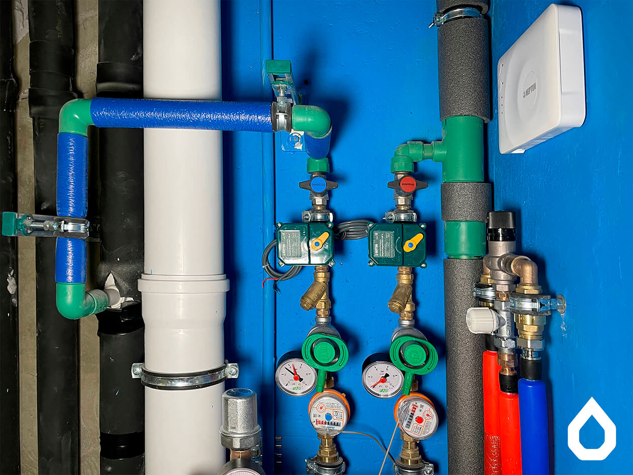 На узле ввода всё как мы любим — шаровый кран Oventrop «Optibal», защита от протечки Neptun, косой фильтр ITAP, редуктор давления FAR ВР-ВР с манометром, обратный клапан ITAP и фильтр тонкой очистки FAR. Поставили трубы ТЕСЕ и Rehau «RAUTITAN stabil». Коллекторы — FAR «MULTIFAR» 1 × ¾. Канализация из Rehau и Ostendorf.