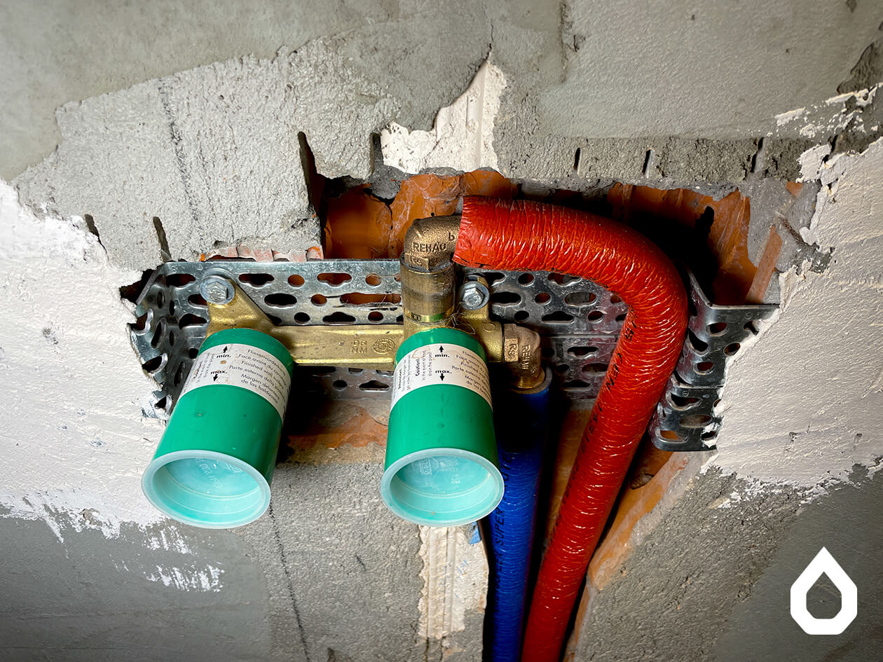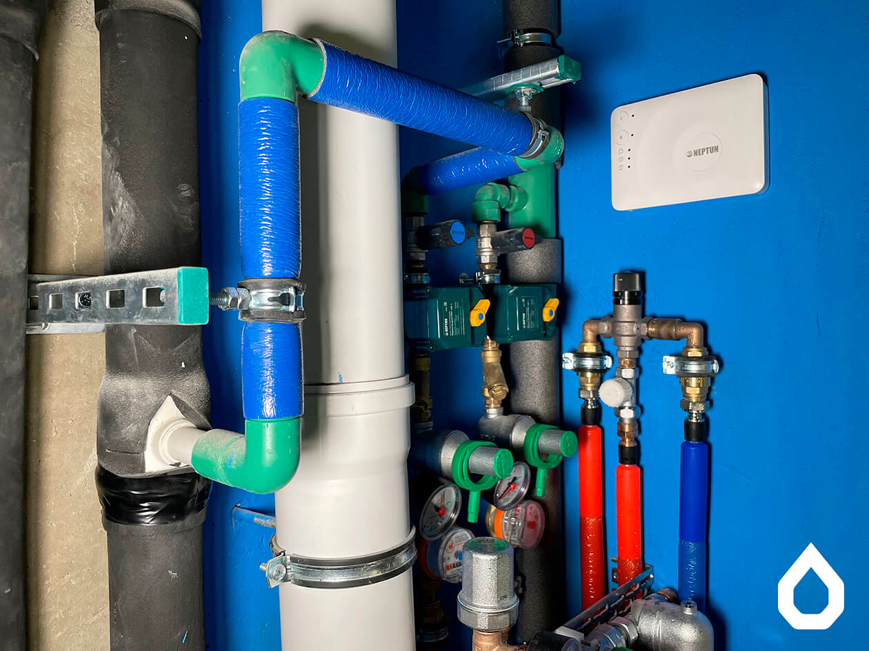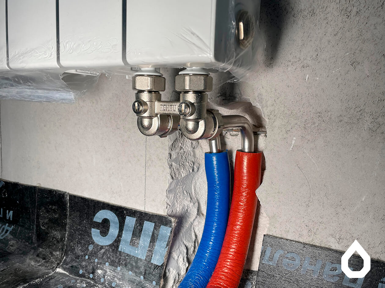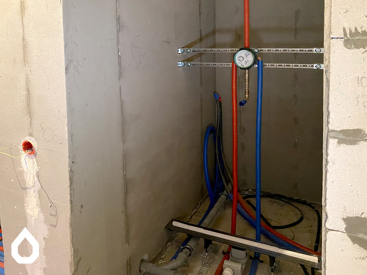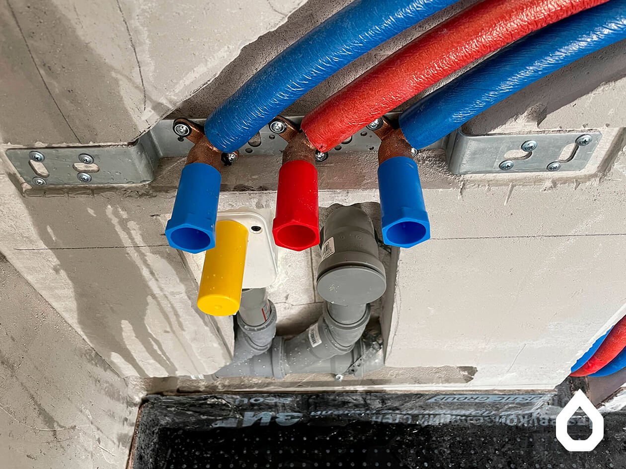 На узле ввода всё как мы любим — шаровый кран Oventrop «Optibal», защита от протечки Neptun, косой фильтр ITAP, редуктор давления FAR ВР-ВР с манометром, обратный клапан ITAP и фильтр тонкой очистки FAR. Поставили трубы ТЕСЕ и Rehau «RAUTITAN stabil». Коллекторы — FAR «MULTIFAR» 1 × ¾. Канализация из Rehau и Ostendorf.