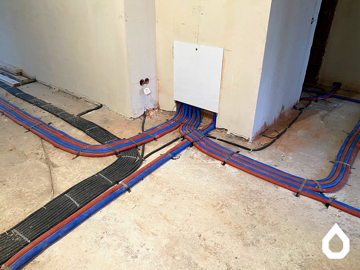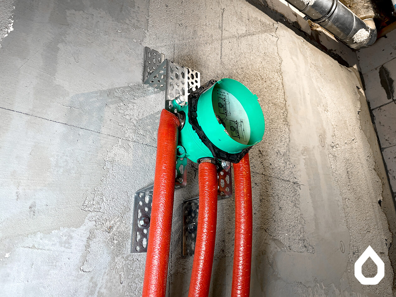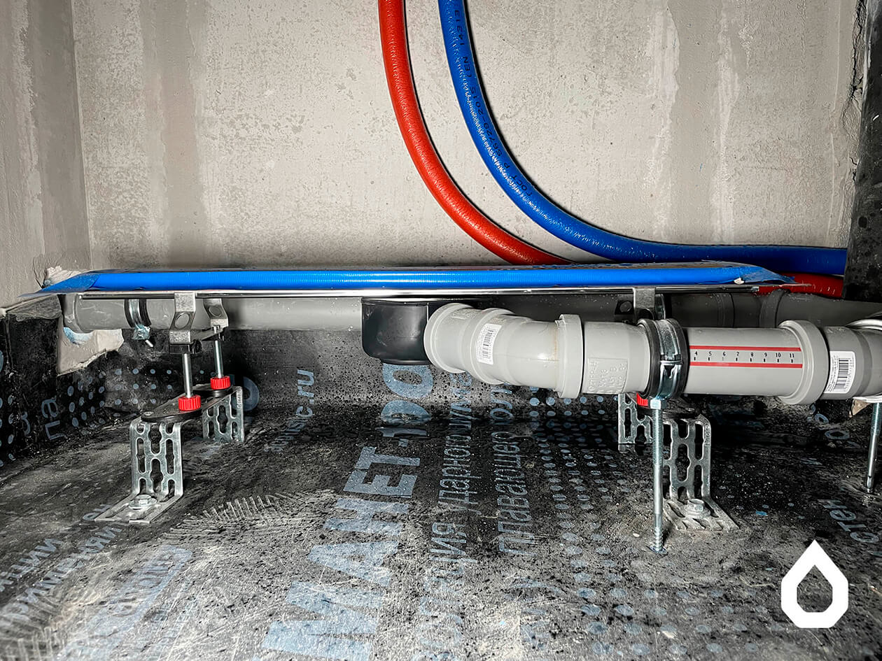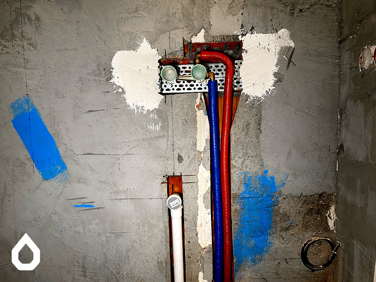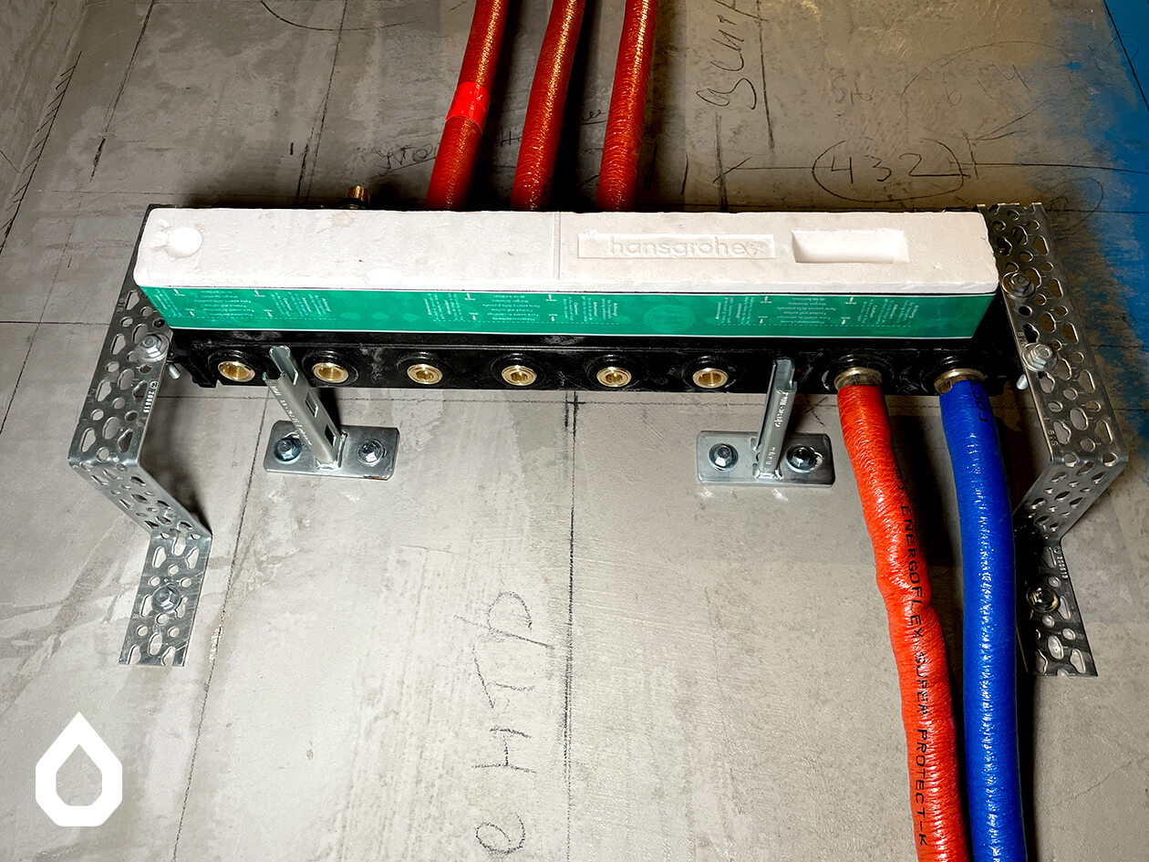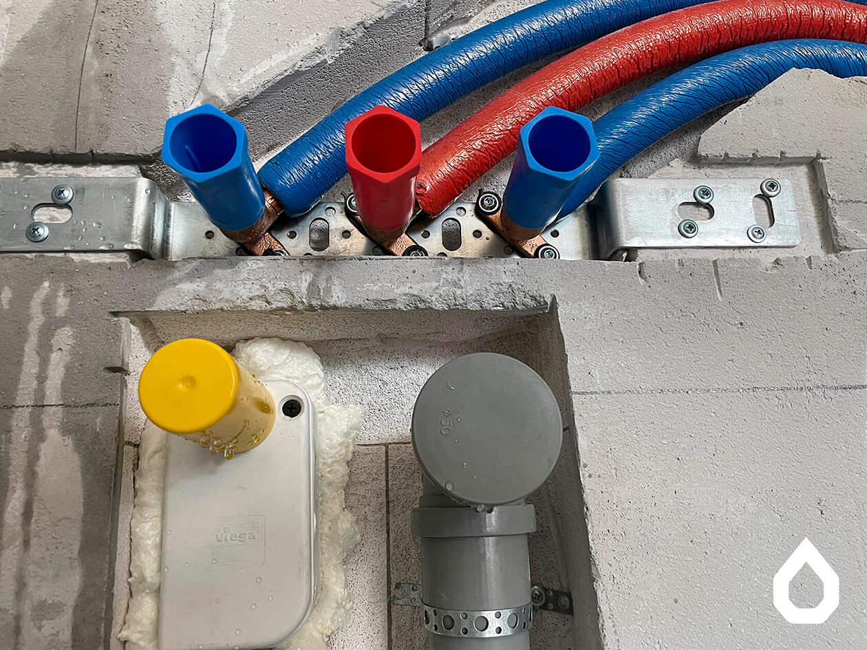 На узле ввода всё как мы любим — шаровый кран Oventrop «Optibal», защита от протечки Neptun, косой фильтр ITAP, редуктор давления FAR ВР-ВР с манометром, обратный клапан ITAP и фильтр тонкой очистки FAR. Поставили трубы ТЕСЕ и Rehau «RAUTITAN stabil». Коллекторы — FAR «MULTIFAR» 1 × ¾. Канализация из Rehau и Ostendorf.