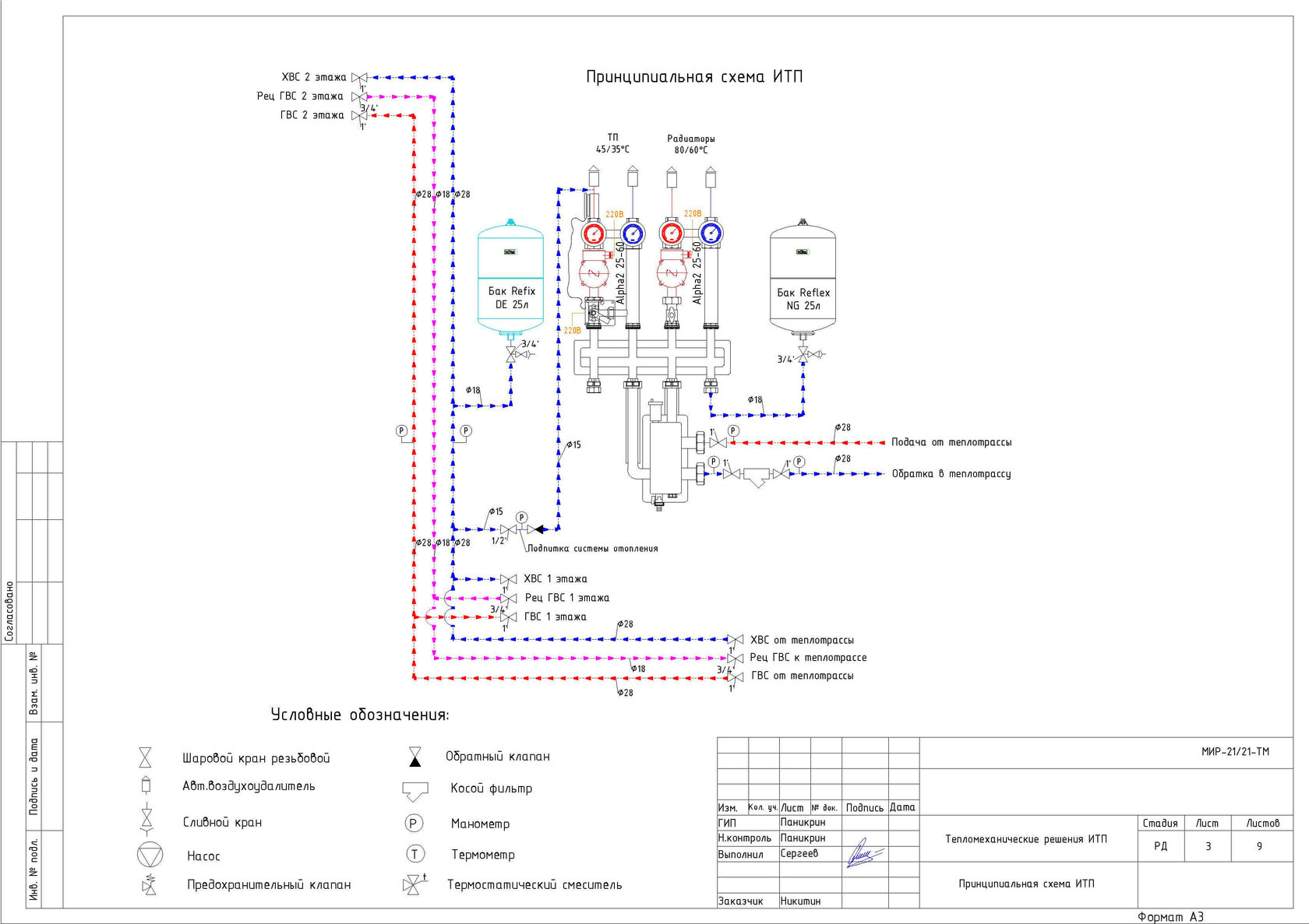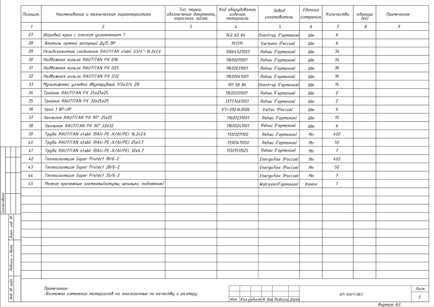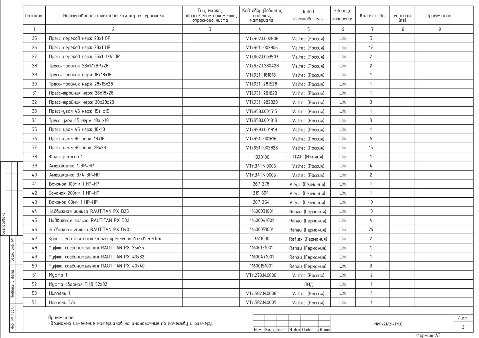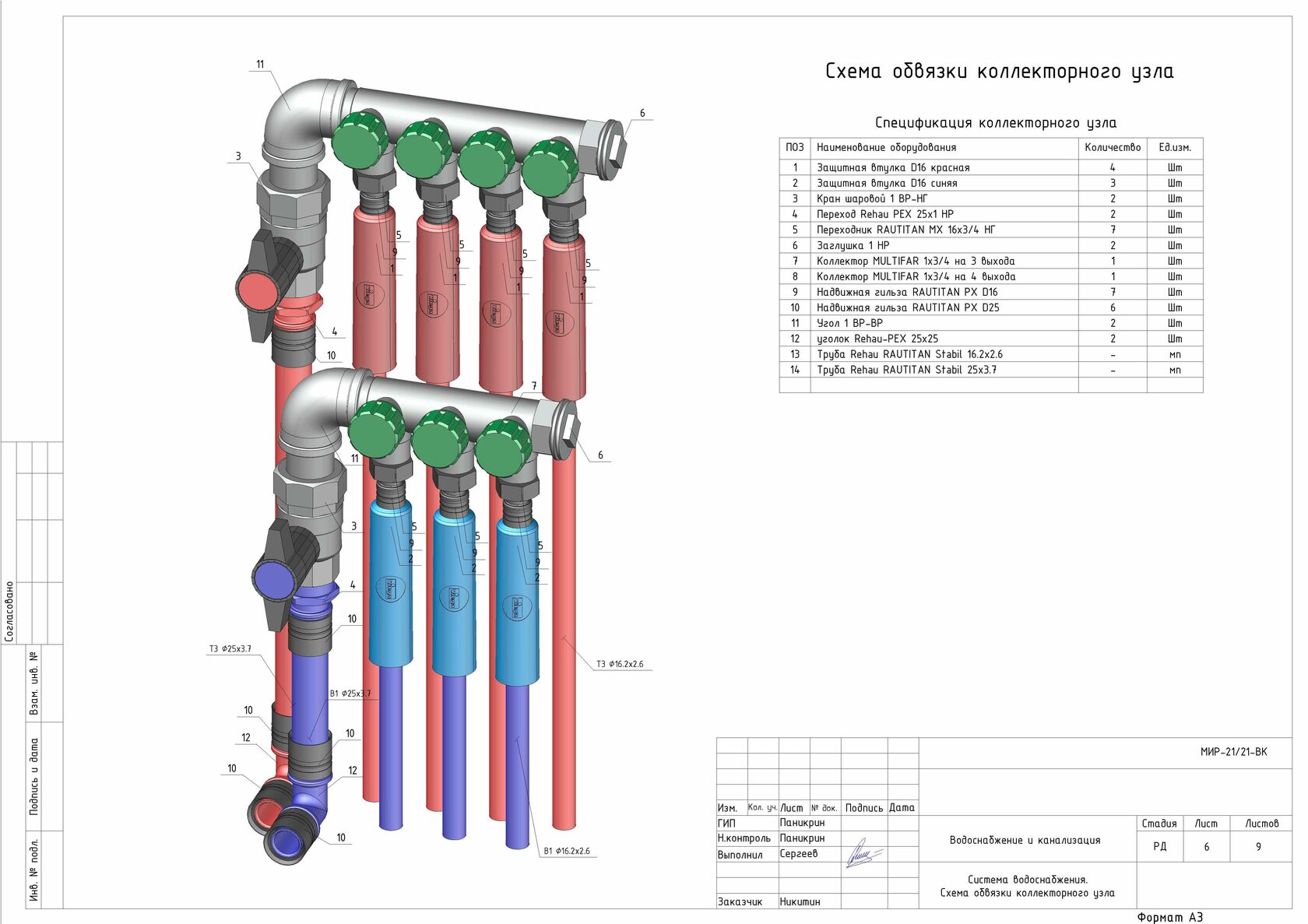В данном проекте система водоснабжения включает в себя распределительные коллекторы и трубопроводы для водоразбора. Узлы ввода и распределения воды находятся в инженерных каналах, позволяя производить очистку и отключение подачи холодной и горячей воды. Система предназначена для хозяйственно-питьевого использования. Вводные элементы включают шаровые краны, комплекты защиты от протечки, фильтры грубой и тонкой очистки, редуктор давления и обратный клапан. Система водопровода спроектирована по коллекторной схеме с использованием сшитого полиэтилена.