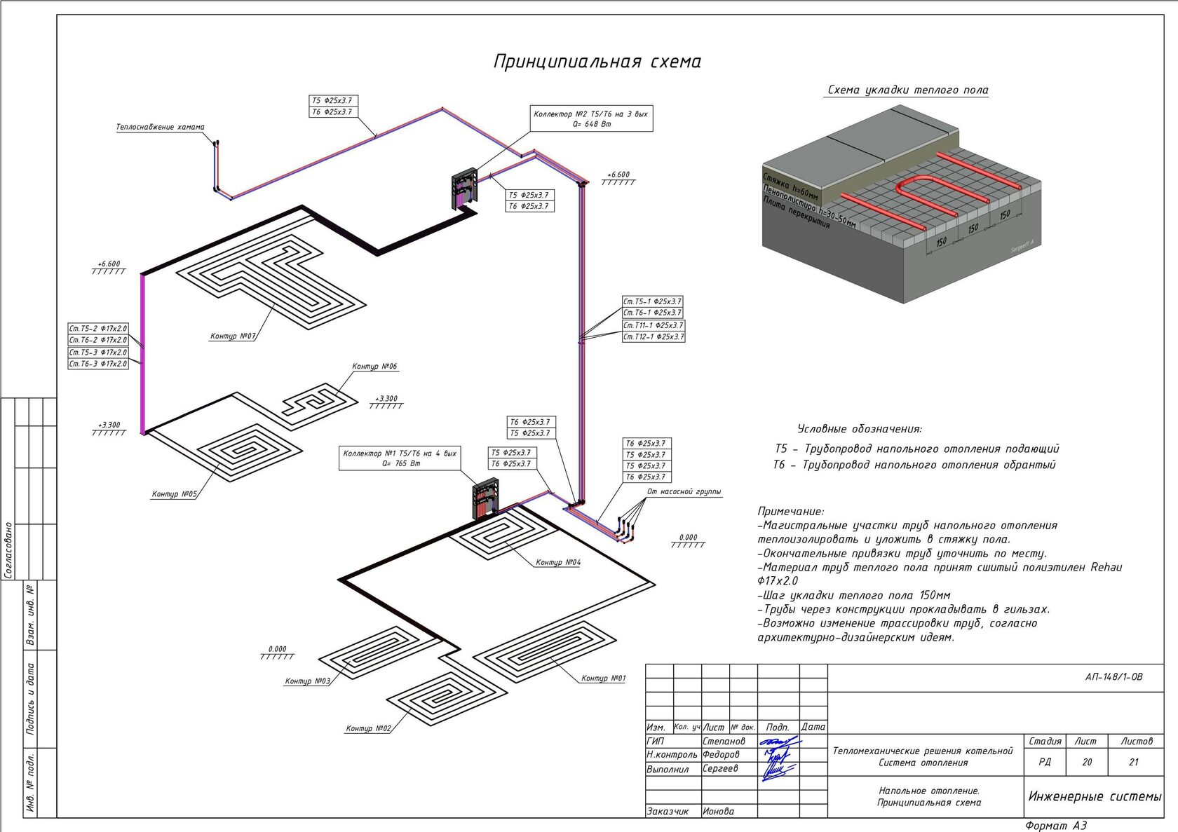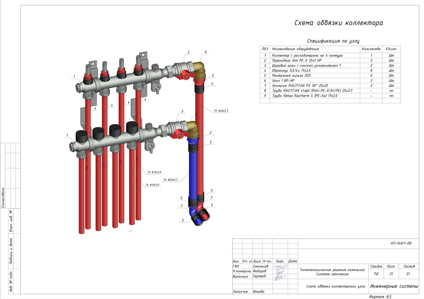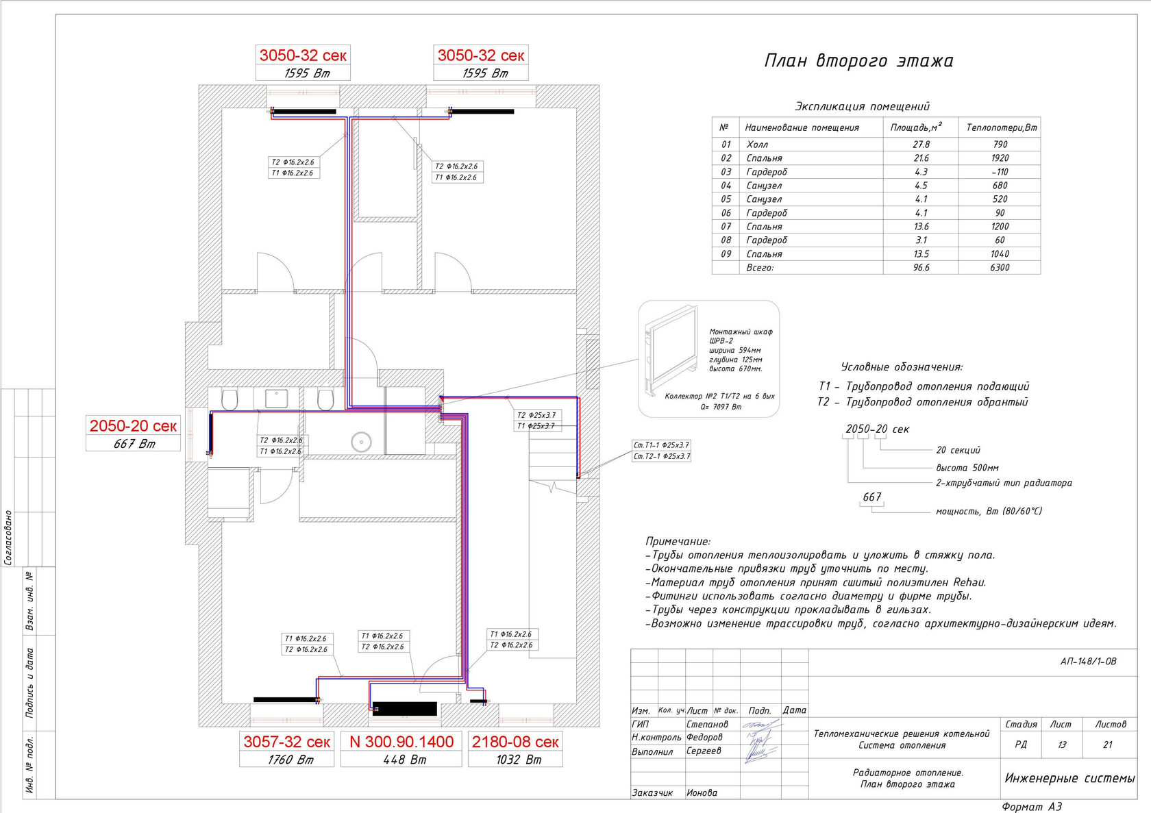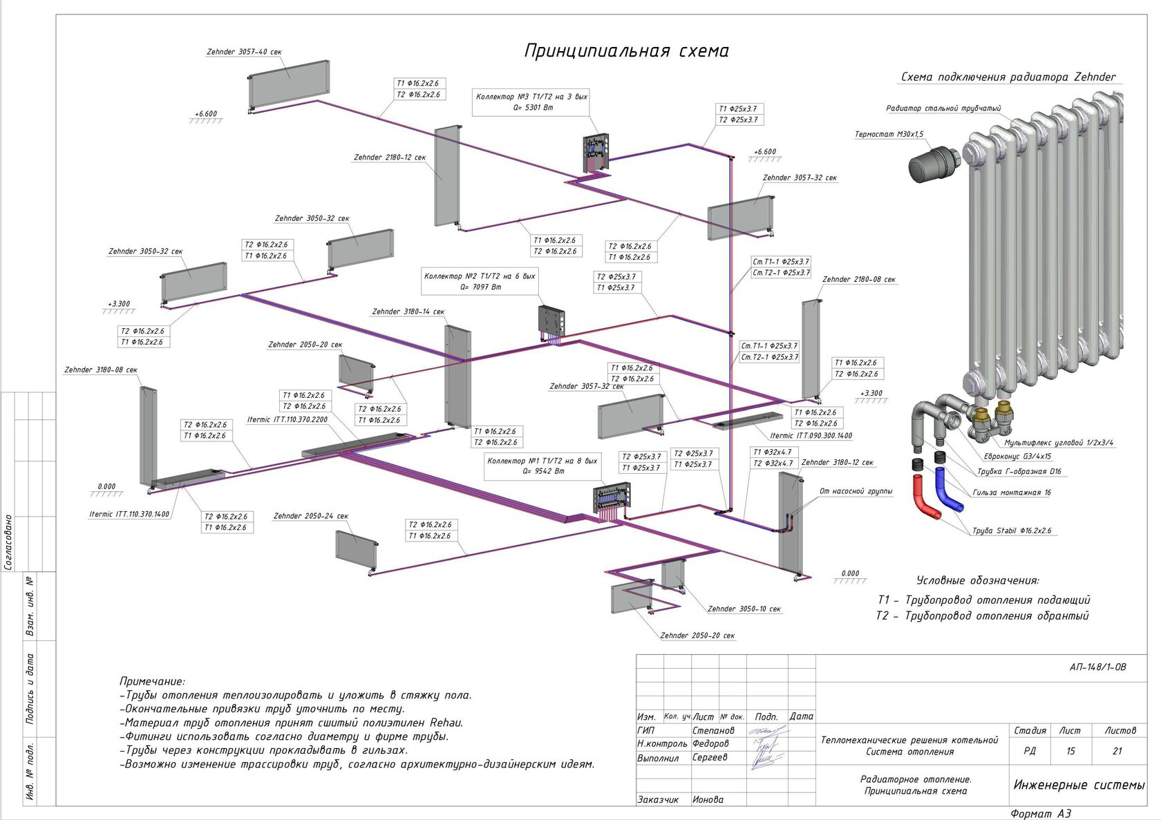 Радиаторное отопление спроектировано по коллекторной схеме с разводкой труб из сшитого полиэтилена Rehau RAUTITAN Stabil, с вентильными вставками Oventrop. Источник теплоснабжения — котел установленный в котельной. Циркуляция теплоносителя в контурах отопления и тёплого пола осуществляется насосной группой. Компенсация тепловых расширений достигается естественными изгибами труб, связанными с планировкой здания.