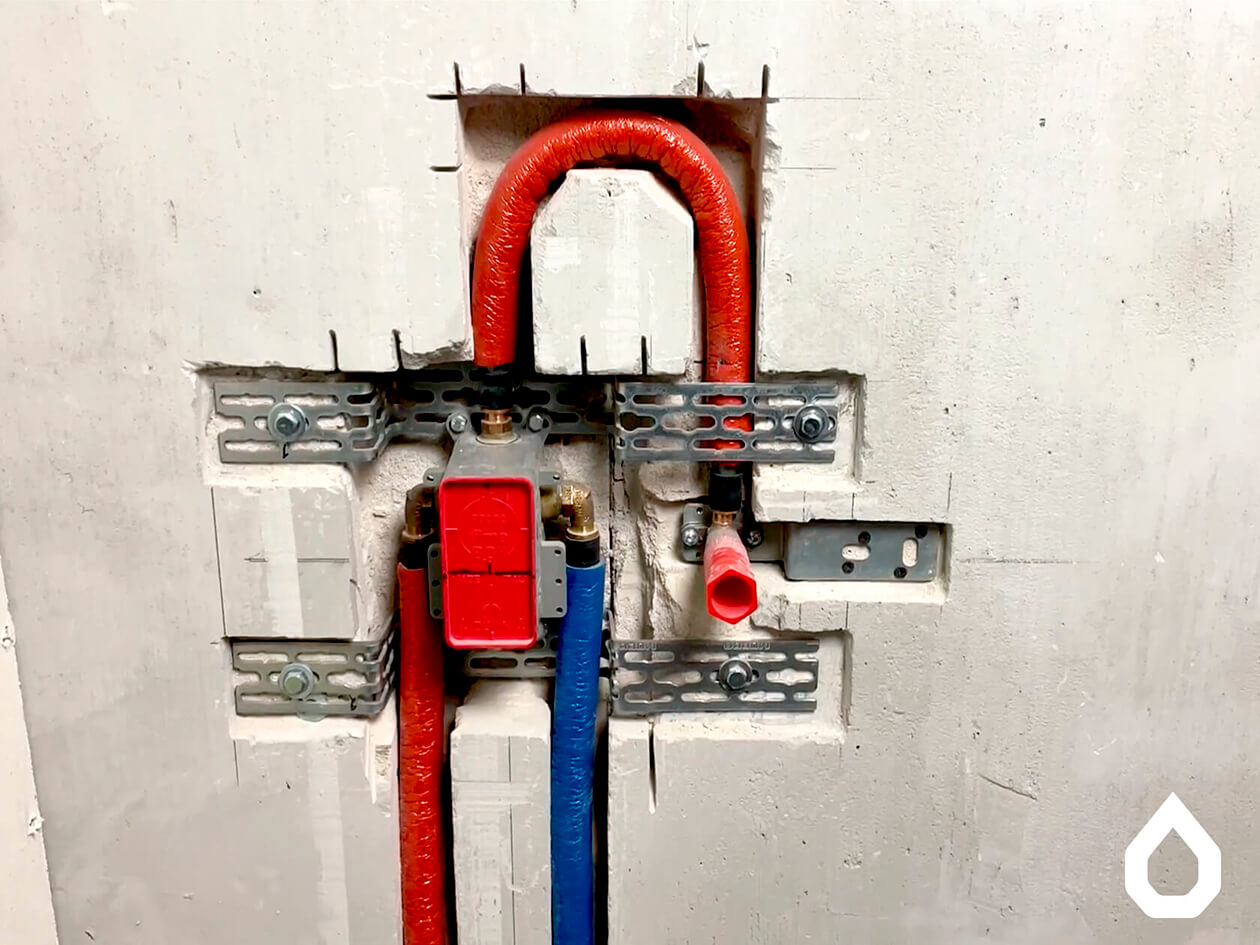 В квартире два узла ввода. Элементы узлов скомпонованы в узкие сантехнические ниши без ущерба удобству эксплуатации. Выбрали для водоснабжения оборудование топовых производителей — Rehau, TECE, Clage, Viega, Watts, FAR, Walraven.