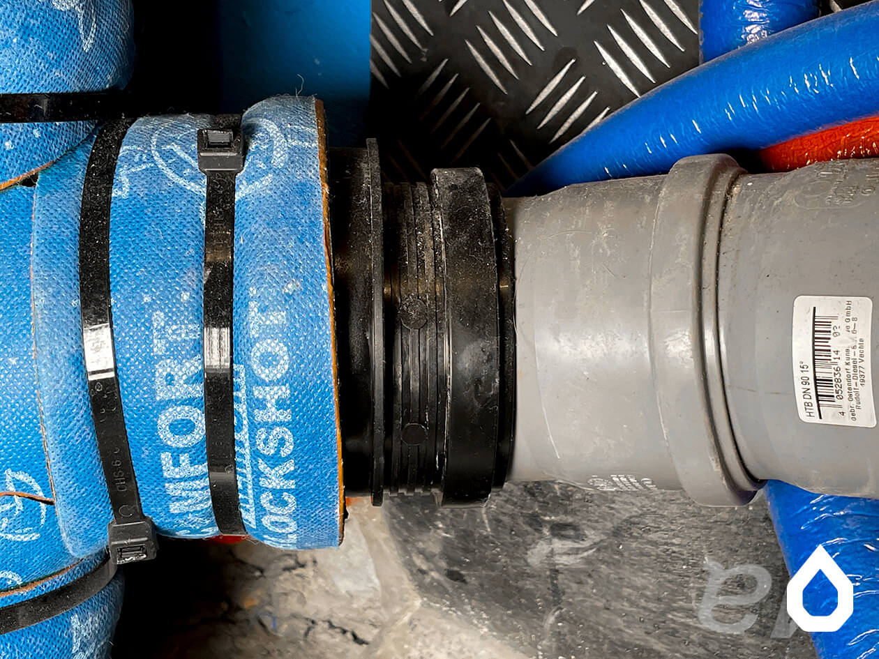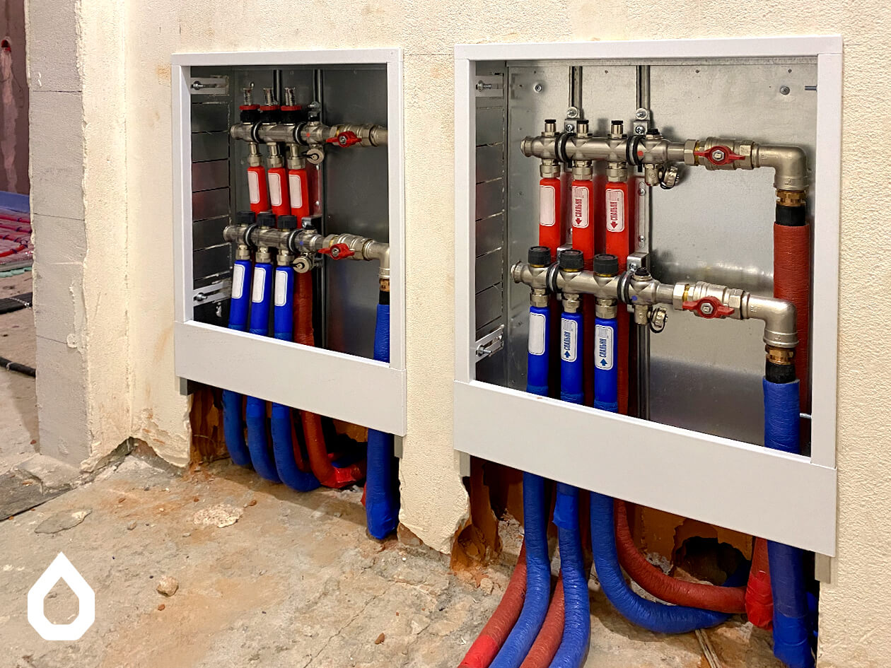 В квартире три узла ввода и распределения. На вводах стандартные наборы элементов — см. описание к проекту квартиры в ЖК «ЗилАрт» ↑. Два узла с магистральными фильтрами Гейзер «Премьер 10BB». Водопровод спроектирован по коллекторной схеме, трубы ТЕСЕ из сшитого полиэтилена. Коллекторы — Oventrop «Multidis R» ¾ × ¾ под евроконус. Канализация — PPs Ostendorf диаметром 40–110 мм.