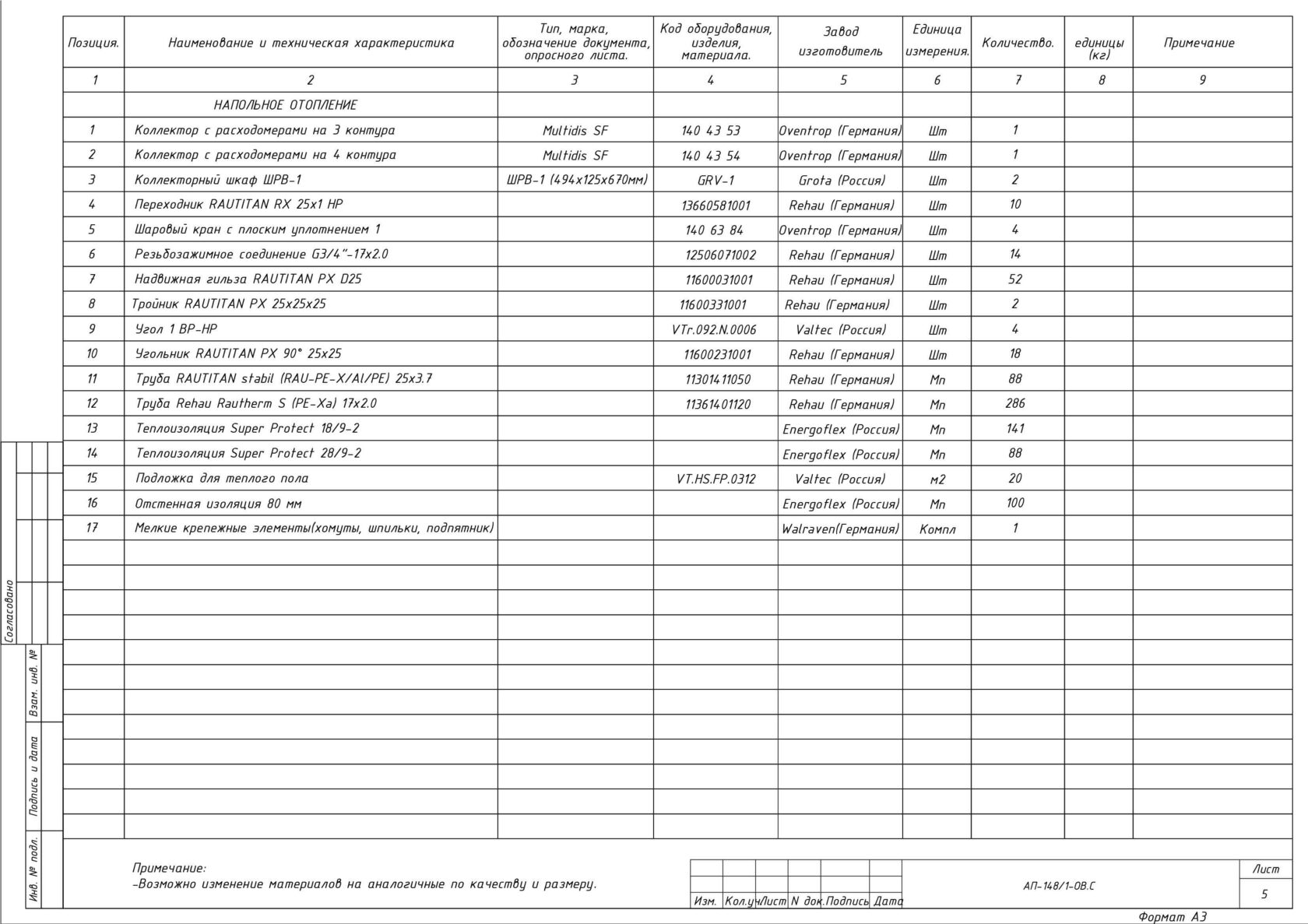 Отопление стальными панельными радиаторами Kermi FTV, трубчатыми Zehnder Charleston и внутрипольными конвекторами Varmann. Обвязка с использованием мультифлексов и вентильных кранов. В качестве трубопроводов используются трубы Rehau RAUTITAN Stabil из сшитого полиэтилена. Схема разводки — коллекторно-лучевая. Коллектор с вентильными вставками Oventrop. Для контуров тёплого пола использованы трубы Rehau Rautherm ∅17×2,0 и коллектор Oventrop с расходомерами.